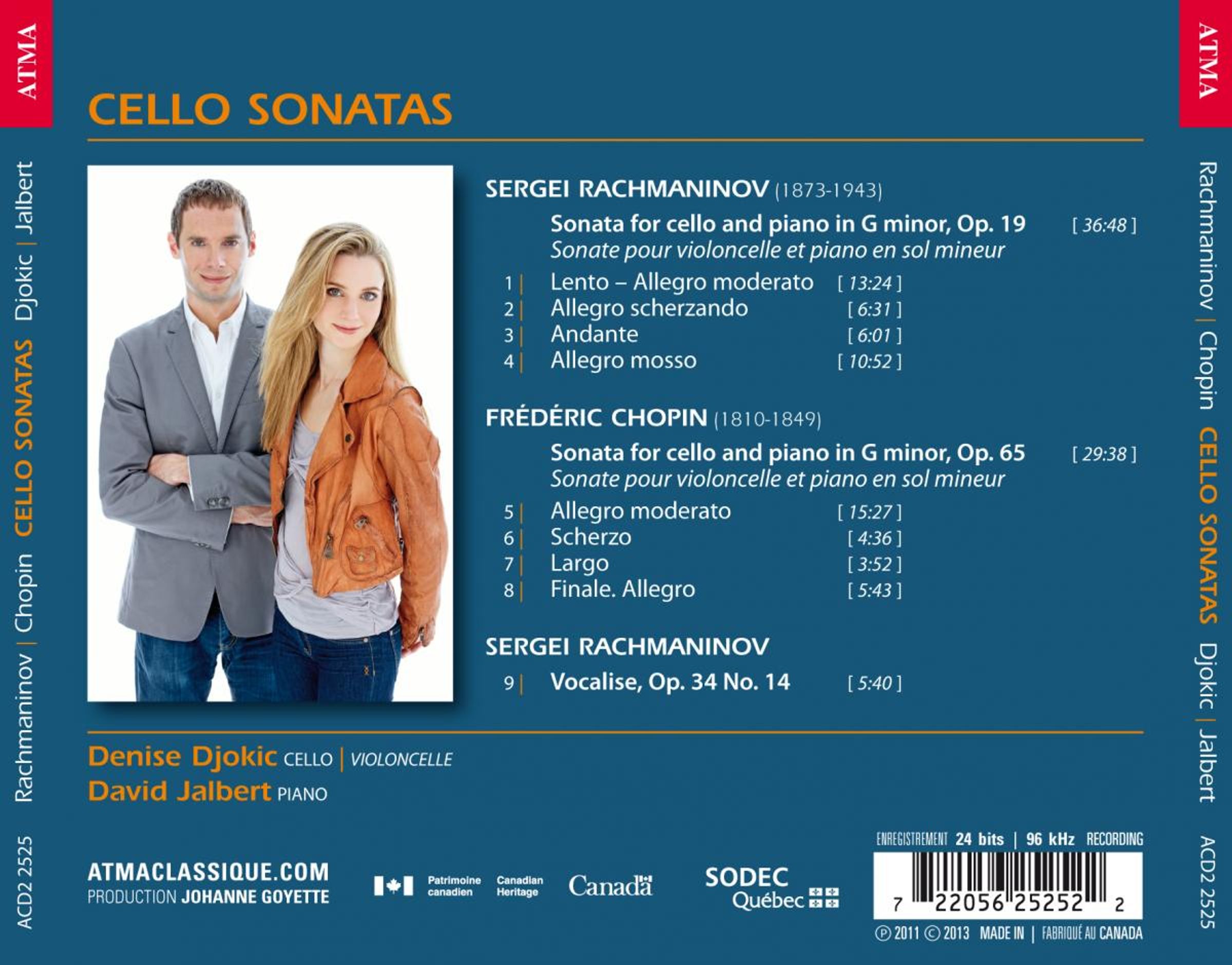 Die Cellistin Denise Djokic wird weltweit für die Aufrichtigkeit und Kraft ihrer Interpretationen sowie für ihre makellose Instrumentaltechnik gelobt. Für ihre zweite Solo-CD mit ATMA Classique wählte sie Werke für Cello und Klavier von Chopin und Rachmaninow; Begleitet wird sie von David Jalbert, ihrem treuen Kammermusikpartner.