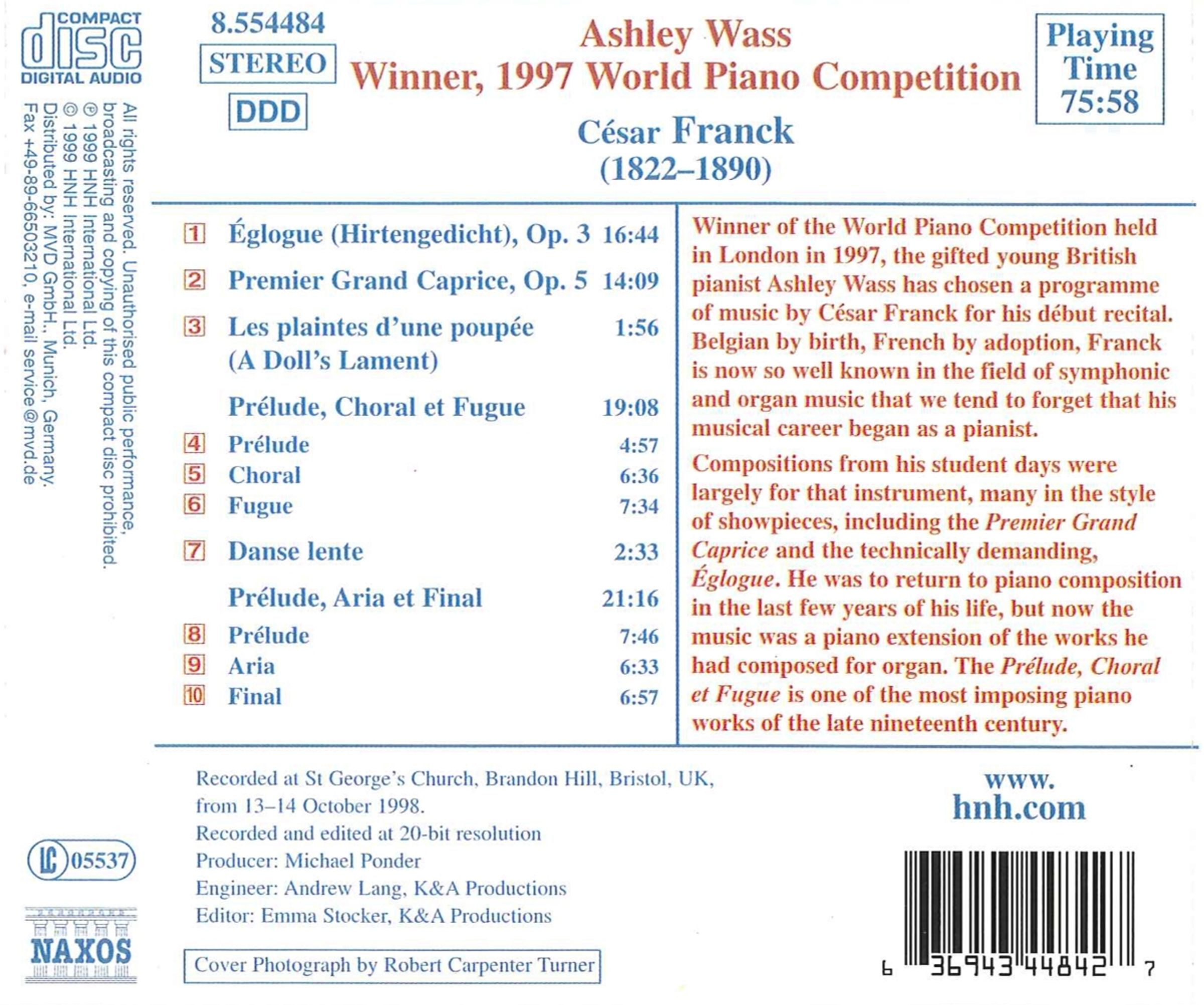 P. Cosse in KLASSIK heute 3/00: "Ashley Wass wurde 1997 mit dem ersten Preis in der sogenannten "World Piano Competition" ausgezeichnet - als erster Brite" Wie so oft in den biographischen Mitteilungen vermißt man aber auch hier das Geburtsdatum und den -Ort. Das würde dem Hörer etwas den Hintergrund eines Künstlers näherbringen, der sich mit diesem Franck-Programm als Pianist von jugendlicher Kraft, von Einfühlungsvermögen in die werkspezifischen Tatbestände erweist. Aber auch als Pianist, der mit flinken, unerbittlichen Fingern, die Arpeggien im 'Choral'-Teil zwischen den berühmten 'Prelude'- und 'Fugue'-Abschnitten hinaufhetzt."Disk 1 von 1 (CD)