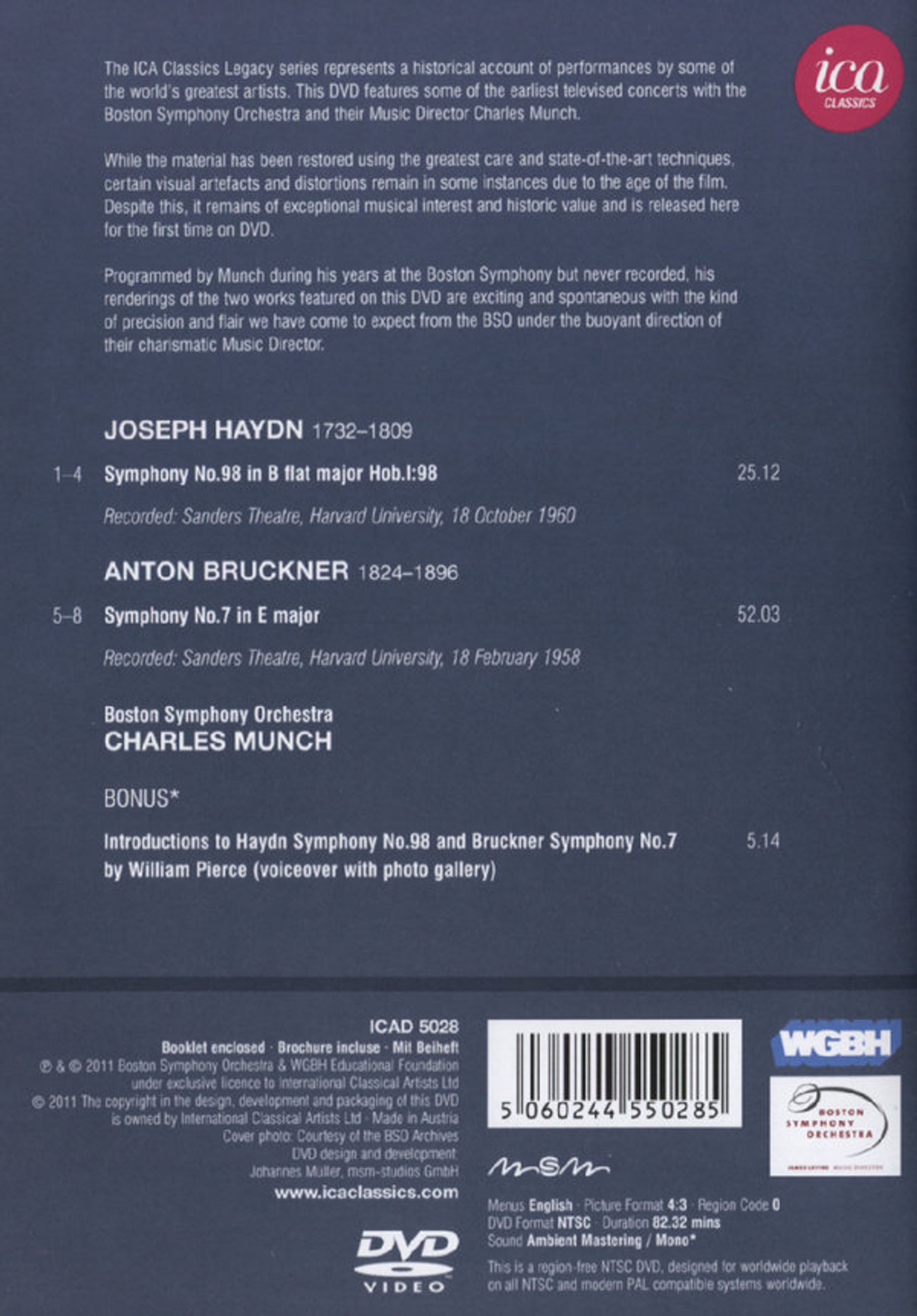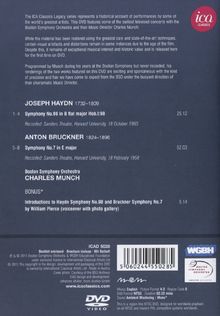 1955 führte Charles Munch das Boston Symphony Orchestra in die Fernsehwelt ein. Er war eine charismatische Persönlichkeit, wie geschaffen für das neue Medium, mit einer stämmigen Statur, weißem Schopf und einem verschmitzten Lächeln. Es verwundert nicht, dass ihm einige nerzbehangene Matronen der Bostoner High-Society den Spitznamen „le beau Charles“ gaben. Haydn kommt Munch im ungestümen, ausgelassenen Temperament sehr entgegen, und die vorliegende Aufnahme von 1960 ist die helle Freude. Bruckner überrascht in der Programmwahl Munchs genauso wie in dessen Ausführung. Ungeachtet der Angaben des Komponisten drückt Munch mächtig auf’s Gas und absolviert das Werk in kaum mehr als 50 Minuten. So hörte, fühlte und verstand Munch „seinen“ Bruckner, und das Publikum, das ihm 1958 im Sanders Theatre lauschte, hat keinerlei Einwände erhoben.