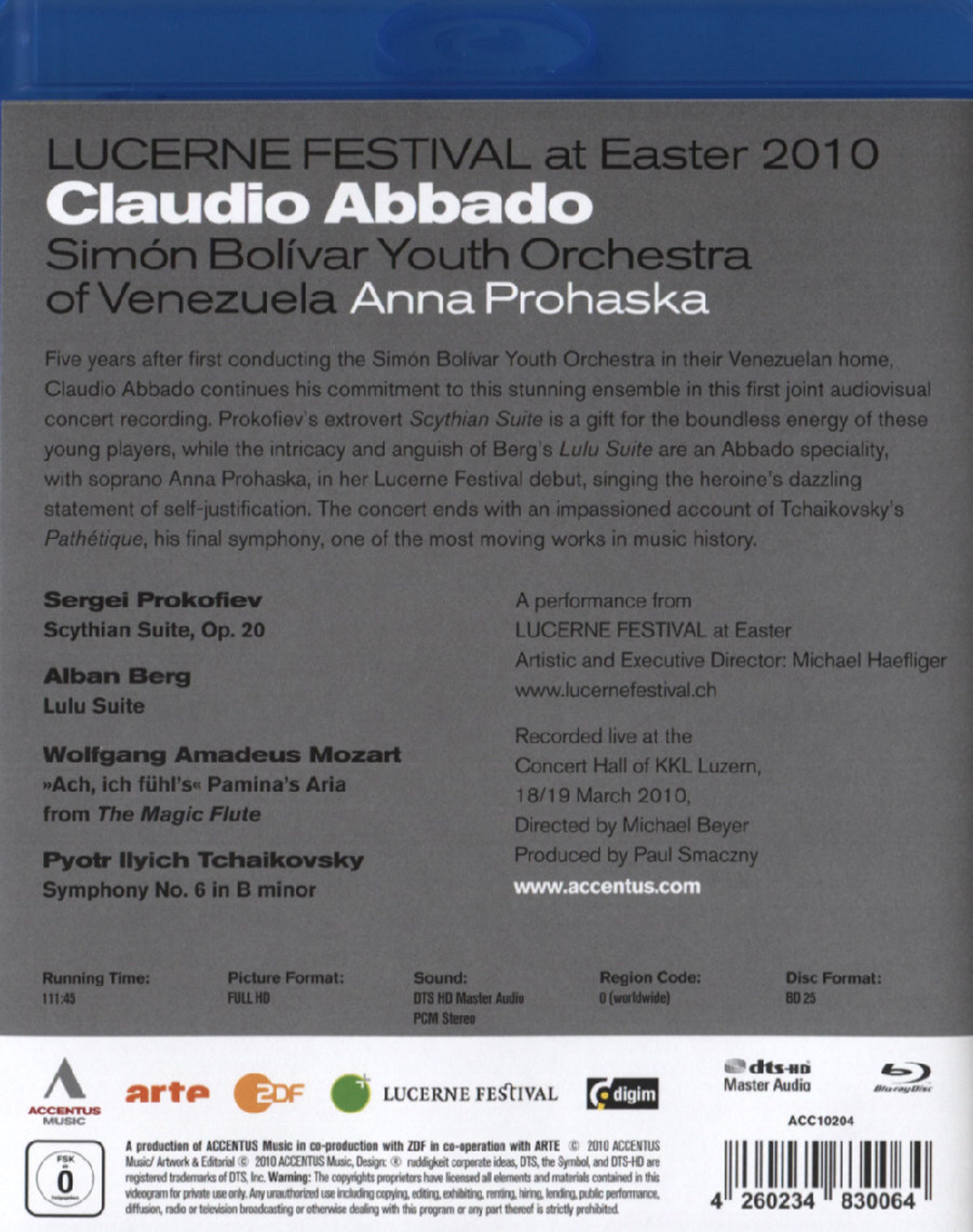 Fünf Jahre nach der ersten Zusammenarbeit mit dem Simón Bolívar Youth Orchestra in dessen venezolanischen Heimat, setzt Claudio Abbado sein Engagement mit diesem erstaunlichen Ensemble fort. Prokofjews mitreißende Skythische Suite ist ein echtes Geschenk für die grenzenlose Energie, die diese jungen Musiker in sich haben. Die Komplexität und Atmosphäre von Seelenpein von Bergs Lulu-Suite sind eine Spezialität für den Maestro Abbado. Die junge Sopranistin Anna Prohaska, die mit diesem Mitschnitt ihr Luzern-Debüt gibt, singt das ergreifende Selbstbekenntnis der Titelfigur. Das Konzert endet mit Tschaikowskis Pathétique, mit der der Komponist seine persönliche Beschreibung einer Reise von der Verzweiflung zur Resignation abgab.