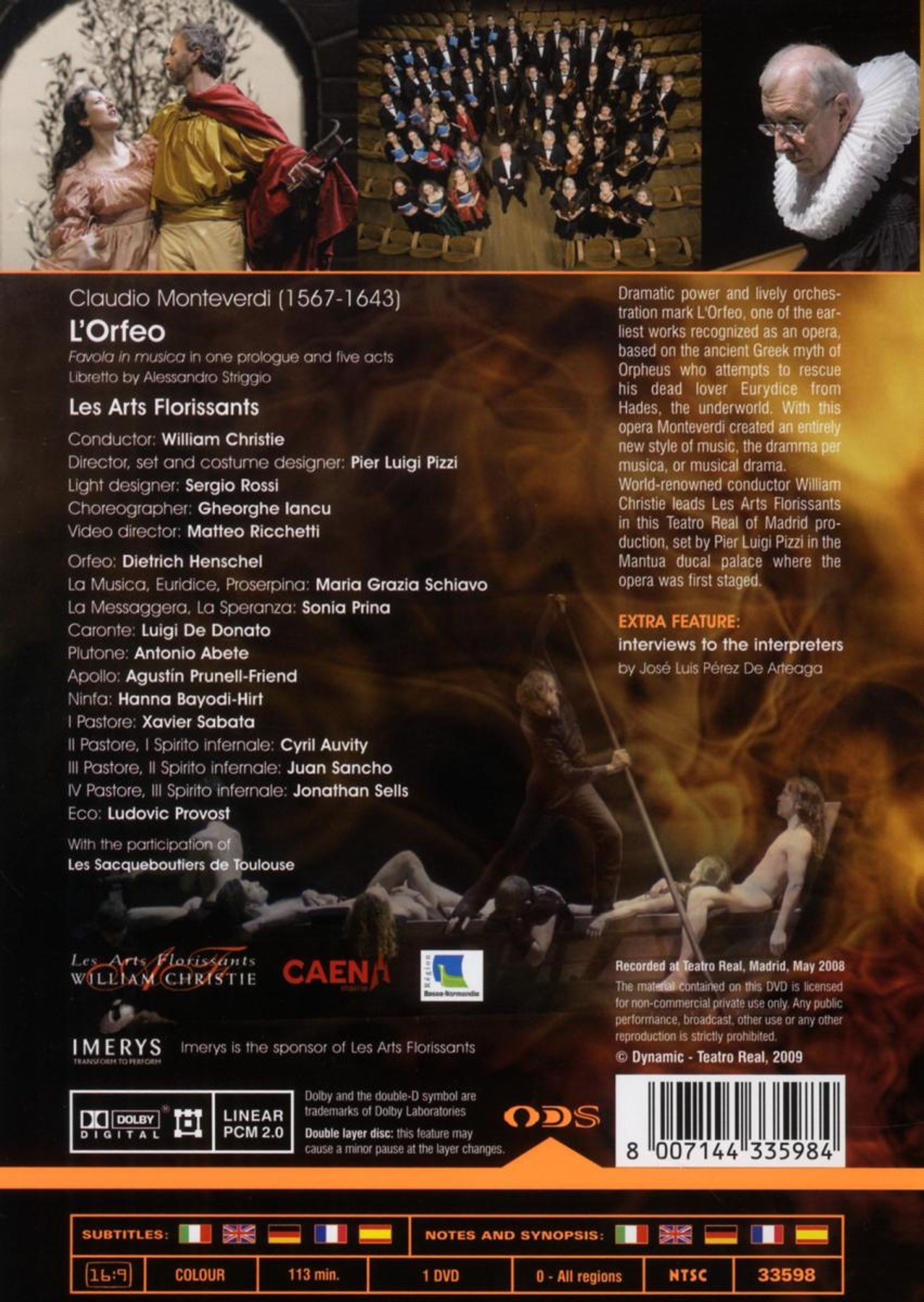 Mit diesem Werk revolutionierte Monteverdi die gerade erst „gegründete“ Gattung der Oper, indem er konsequent auf begleiteten monodischen Gesang setzte; streng genommen ist dies nach unserem heutigen Verständnis die erste „richtige“ Oper überhaupt. Und er bot dem Publikum eine Vielzahl unmissverständlicher musikalischer Verständigungshilfen: Trompeten blasen Signale, dissonante Klänge untermalen Schmerz und Trauer... In den nächsten drei Jahren werden Christie und Les Arts Florissants den gesamten Monteverdi-Zyklus (also alle drei Opern) auf Dynamic veröffentlichen, und dies mit herausragenden Gesangskräften wie Dietrich Henschel, Sonia Prina, Philippe Jaroussky, Danielle de Niese, Maria Grazia Schiavo oder Cyril Auvity. Pizzi setzt bei seiner Regie auf das wunderbare Ambiente des Teatro Real de Madrid in Kombination mit opulenten Kostümen des 17. Jahrhunderts – ein Fest für Augen und Ohren.