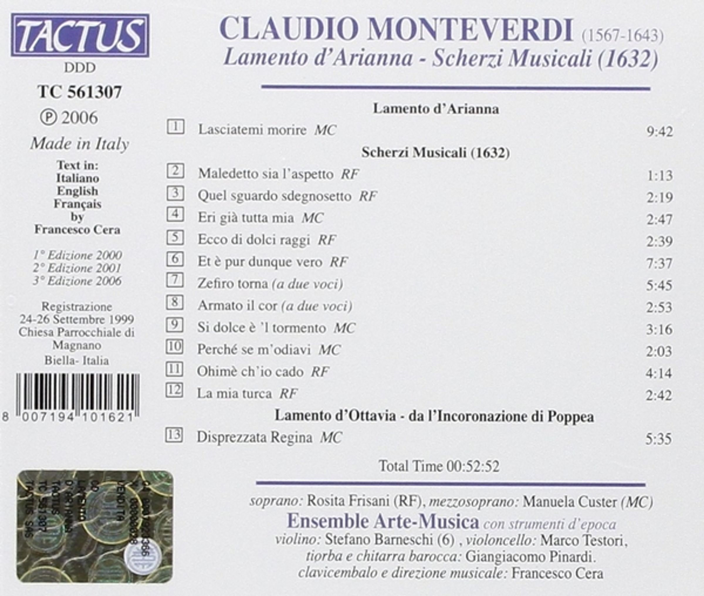 Das Lamento d'Arianna, das von Monteverdis Zeitgenossen als »die schönste Komposition, die je in unserer Zeit geschrieben wurde« angesehen wurde, ist das einzige kostbare Juwel, das von der verlorenen Oper Arianna des großen Komponisten erhalten geblieben ist.