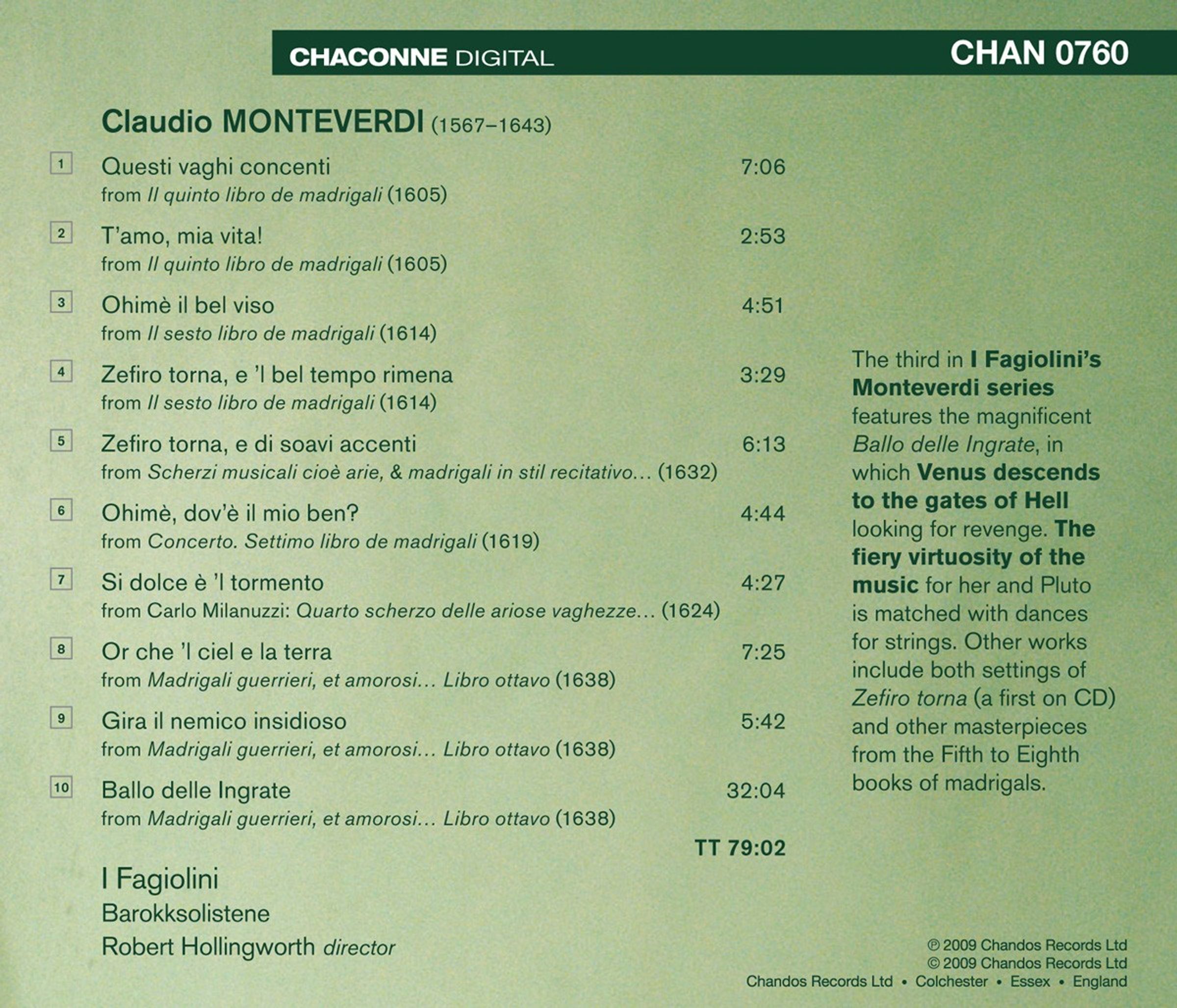T'amo mia vita (Heft 5);Hor che'l ciel e la terra; Ohime, dov'e il mio ben (Heft 7);Ohime il bel viso (Heft 6); Zefiro torna a 5; Zefiro torna a 2; Gira il nemico; Ballo delle ingrate