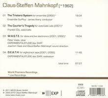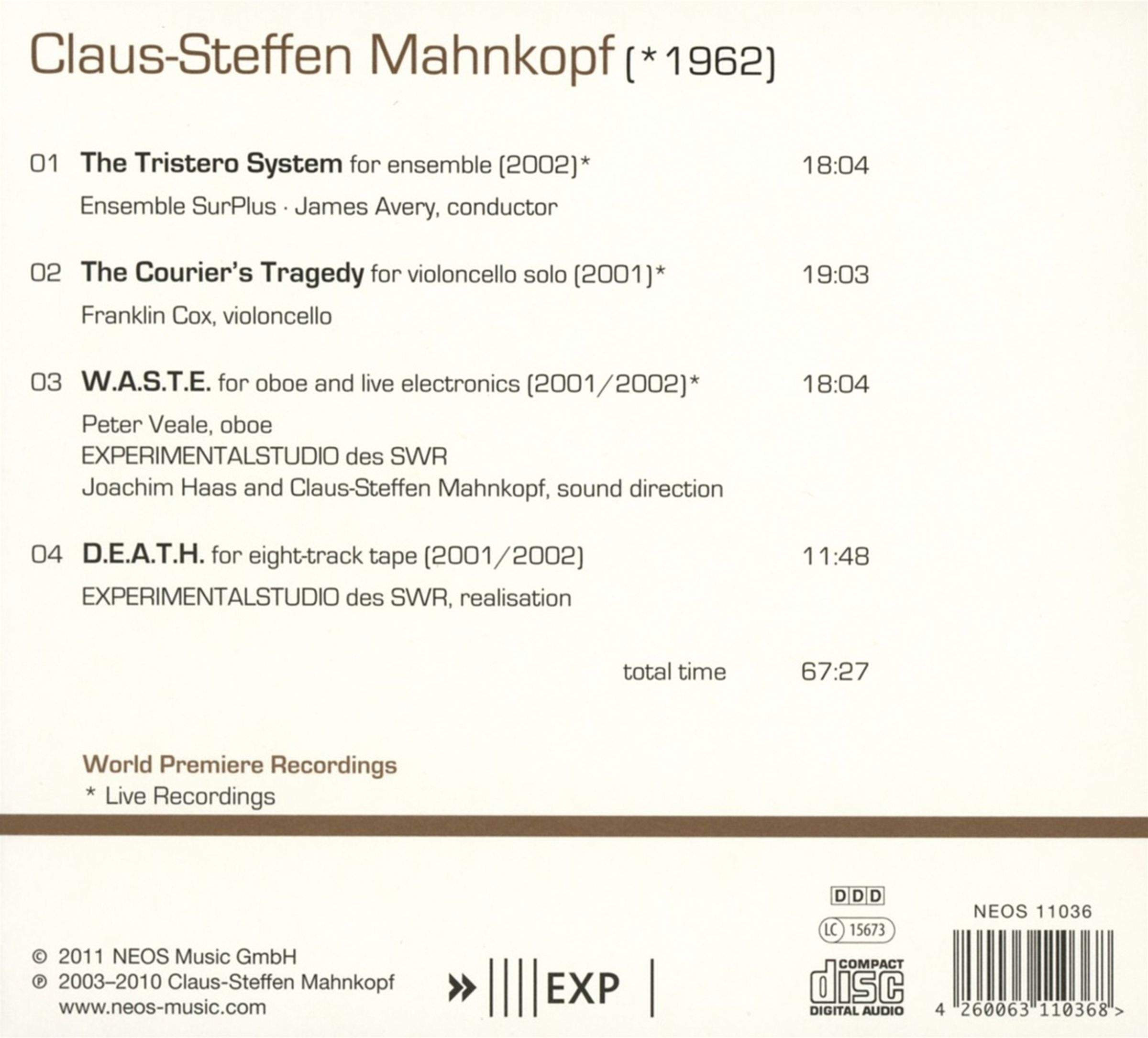 The Tristero System für Ensemble; The Courier's Tragedy für Cello; W. A.S. T.E für Oboe & Live-Elektronik; D. E.A. T.H für Tape