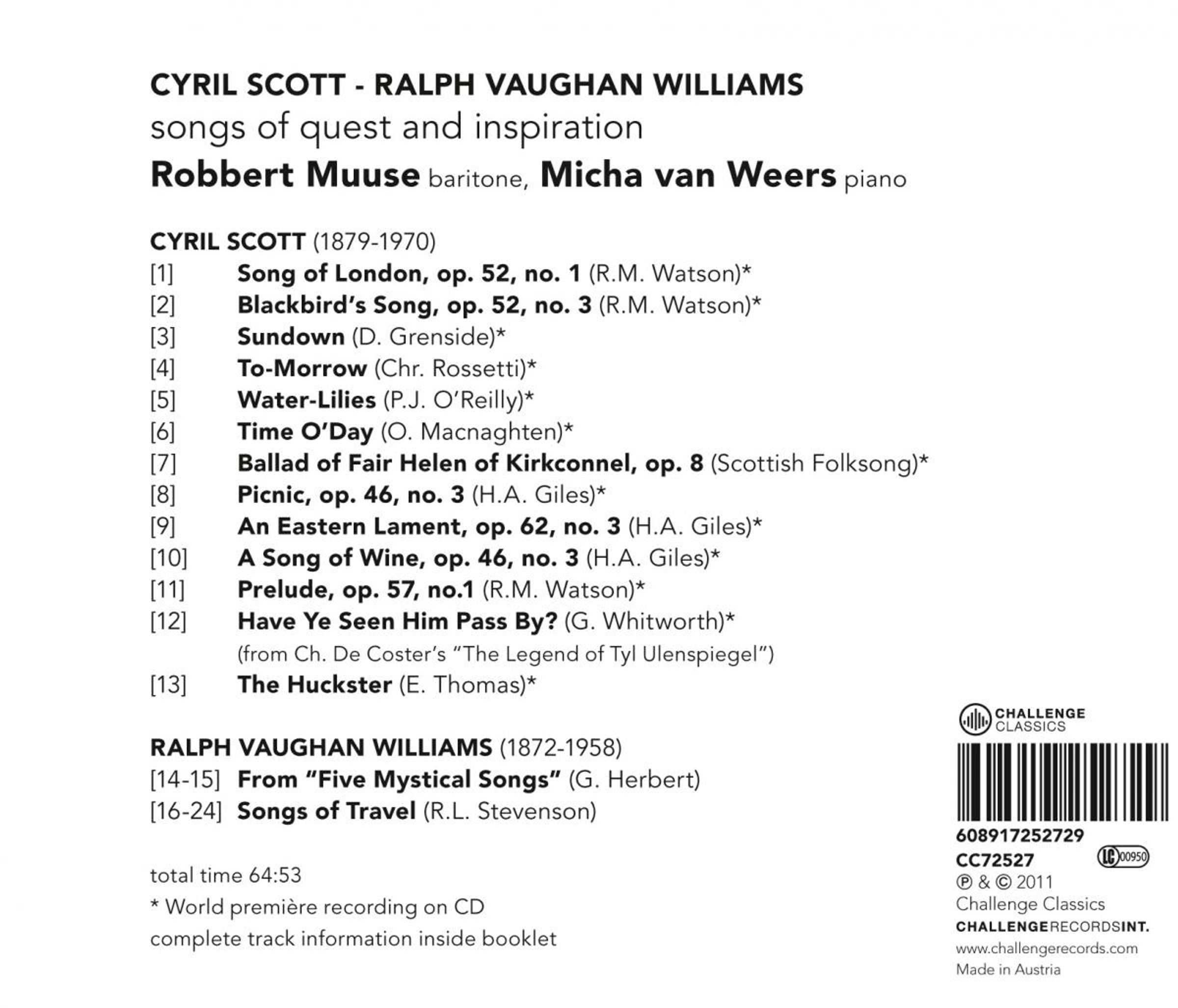 Außer dem vertrauten, wohl bekannten Repertoire fordern Robbert Muuse und Micha van Weers sich heraus, unaufhörlich das Feld von unbekannten Werken, vergessener oder sogar verbotenen Lieder zu erforschen, dass sie für würdig halten, wieder entdeckt und neu geführt zu werden. Diese Forschung führte zu einer Auswahl aus einer Sammlung von etwa 80 Liedern von Cyril Scott, die unserer Generation völlig zu unrecht unbekannt geblieben sind, ergänzt durch bekanntere Lieder von Vaughan Williams wie den Zyklus 'Songs of Travel'.
