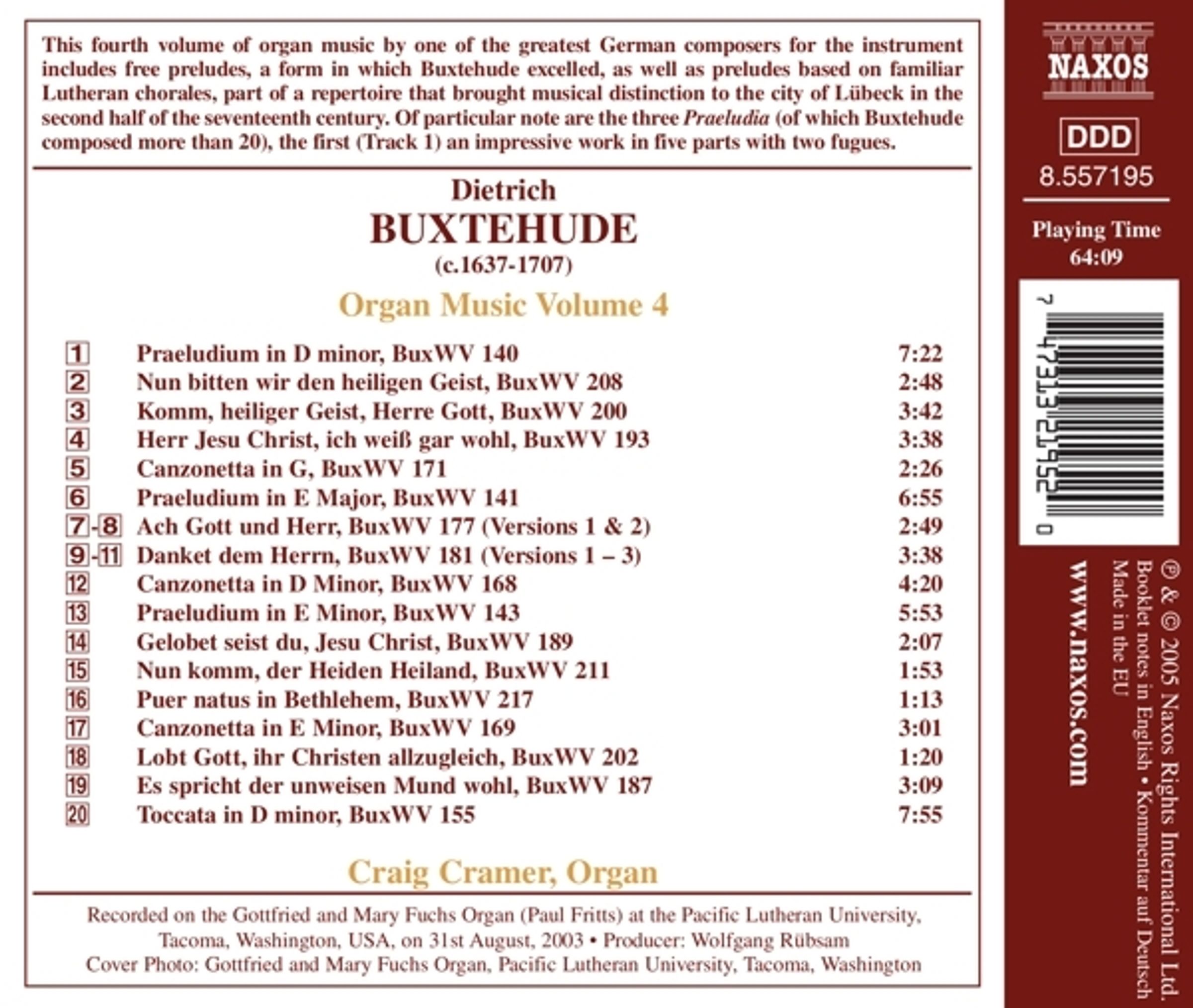 Präludien BuxWV 140, 141, 143; Canzonetten BuxWV 168, 169, 171; Toccata BuxWV 155; Choräle BuxWV 177, 181, 187, 189, 193, 200, 202, 208, 211, 217