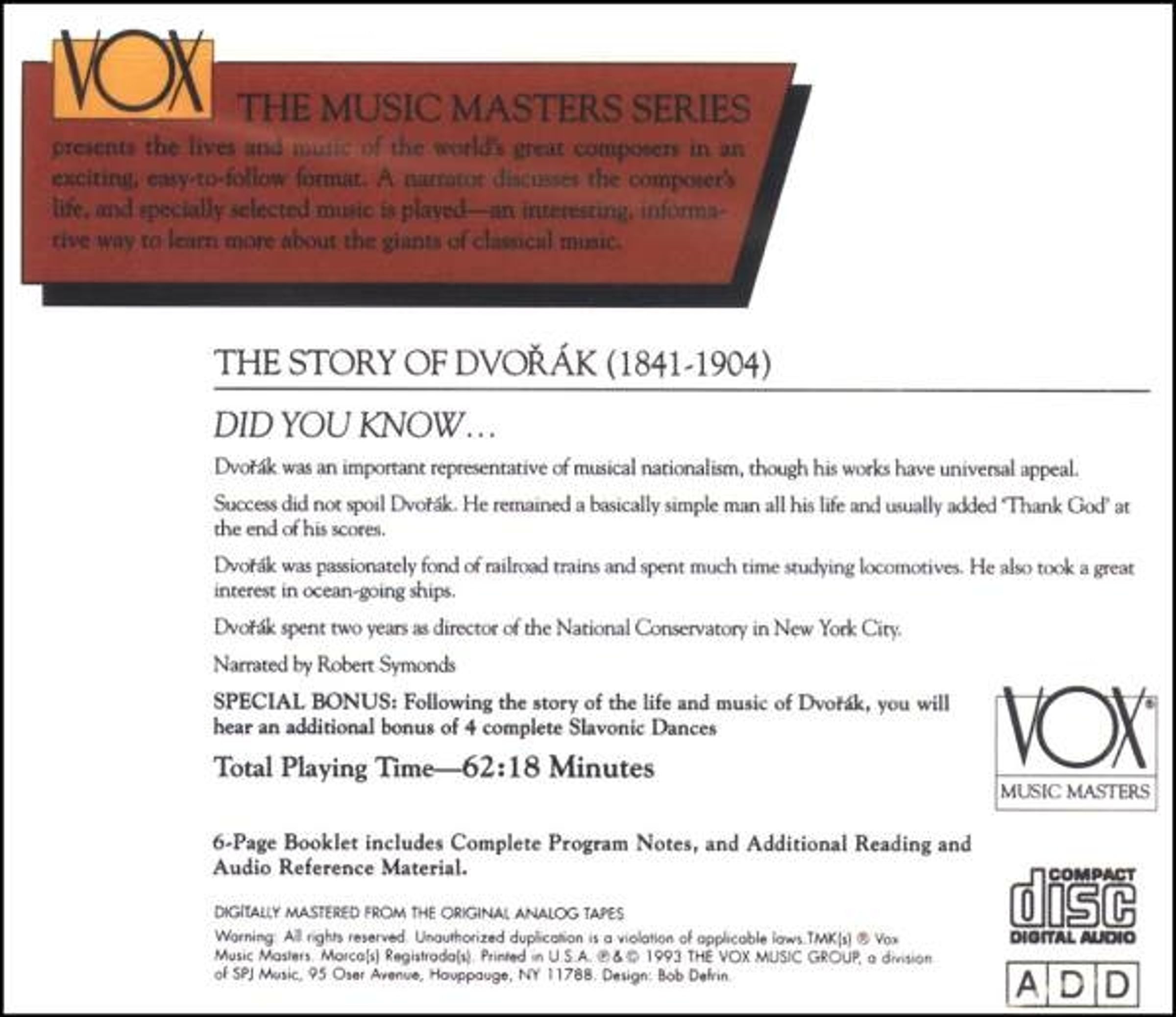 VOX "The Music Masters Series" presents the lives and music of the world's greatest composers in an exciting easy-to-follow format. A narrator discusses the composer's life, and specially selected music is played - an interesting, informative way to learn more about the giants of classical music.