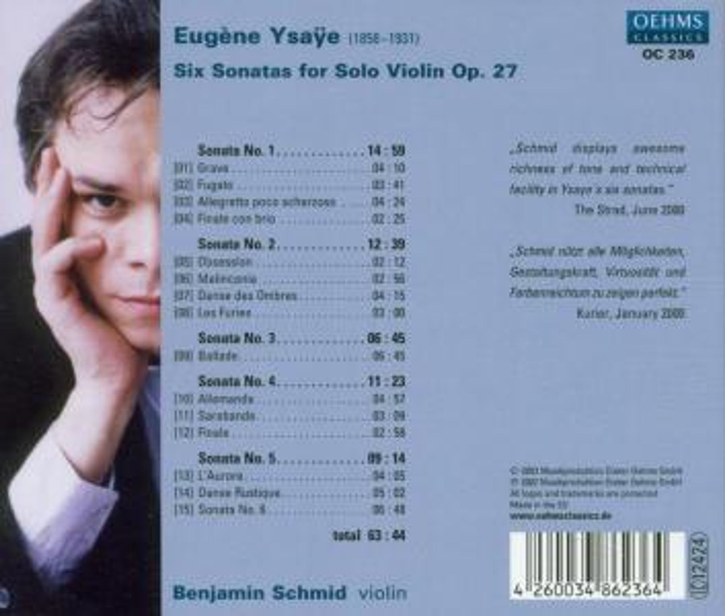 C. Keßler-Vahldieck in FonoForum 12/99: »Der Interpret muß sich mit einer enormen Fülle an technischen Problemen auseinandersetzen, und nur wenige scheinen wahrzunehmen, was laut Ysayes Angaben hinter all der Technik steht. Einer dieser wenigen ist der junge, mehrfach international ausgezeichnete Österreicher Benjamin Schmid. Er ordnet, und dies war wohl die Absicht des Komponisten, sein manuelles Können dem musikalischen Ausdruck unter.«Disk 1 von 1 (CD)