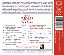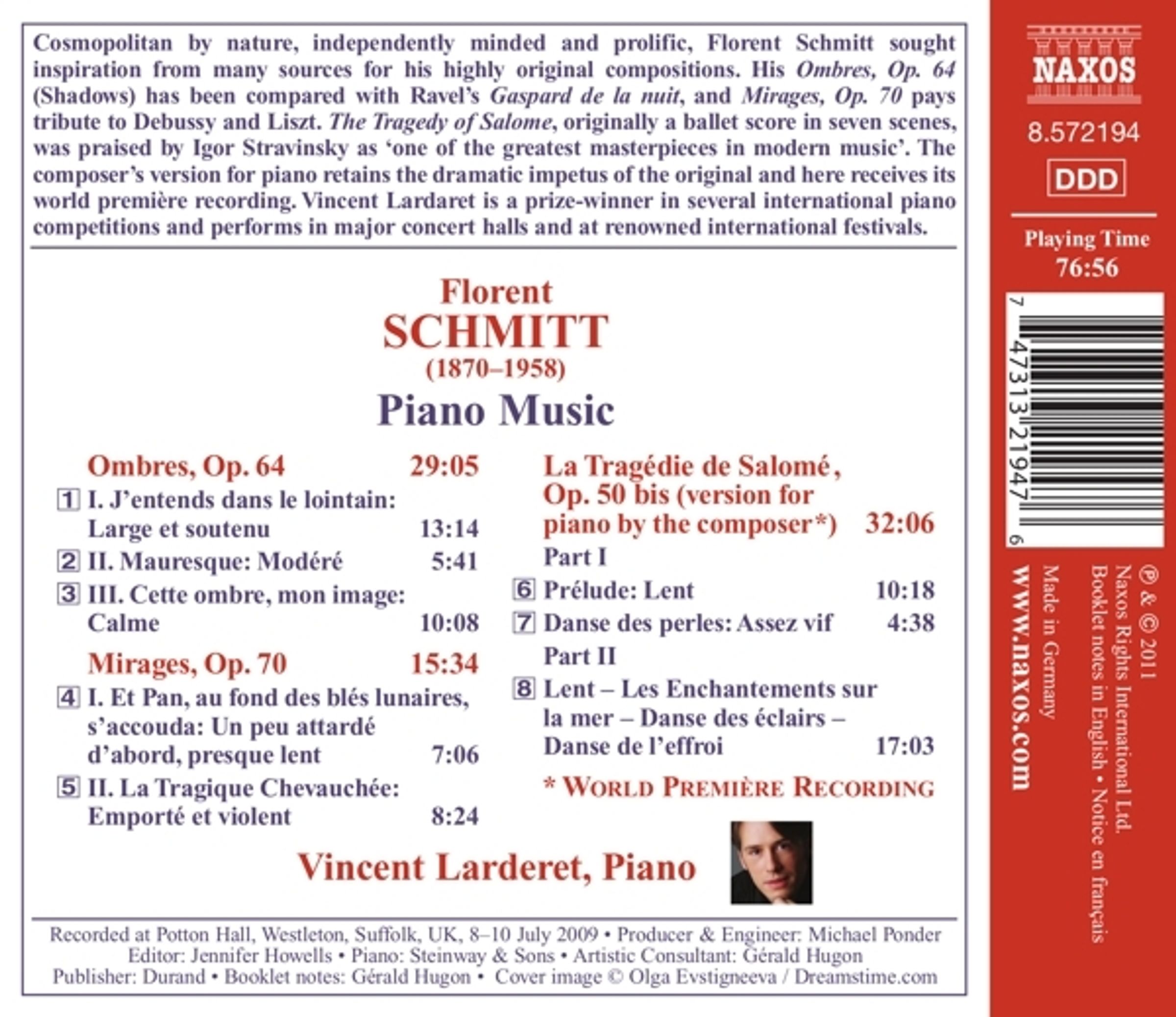 Cosmopolitan by nature, independently minded and prolific, Florent Schmitt sought inspiration from many sources for his highly original compositions. His Ombres, Op. 64 (Shadows) has been compared with Ravel's Gaspard de la nuit, and Mirages, Op. 70 pays tribute to Debussy and Liszt. The Tragedy of Salome, originally a ballet score in seven scenes, was praised by Igor Stravinsky as 'one of the greatest masterpieces in modern music'. The composer's version for piano retains the dramatic impetus of the original and here receives its world première recording. Vincent Lardaret is a prize-winner in several international piano competitions and performs in major concert halls and at renowned international festivals.