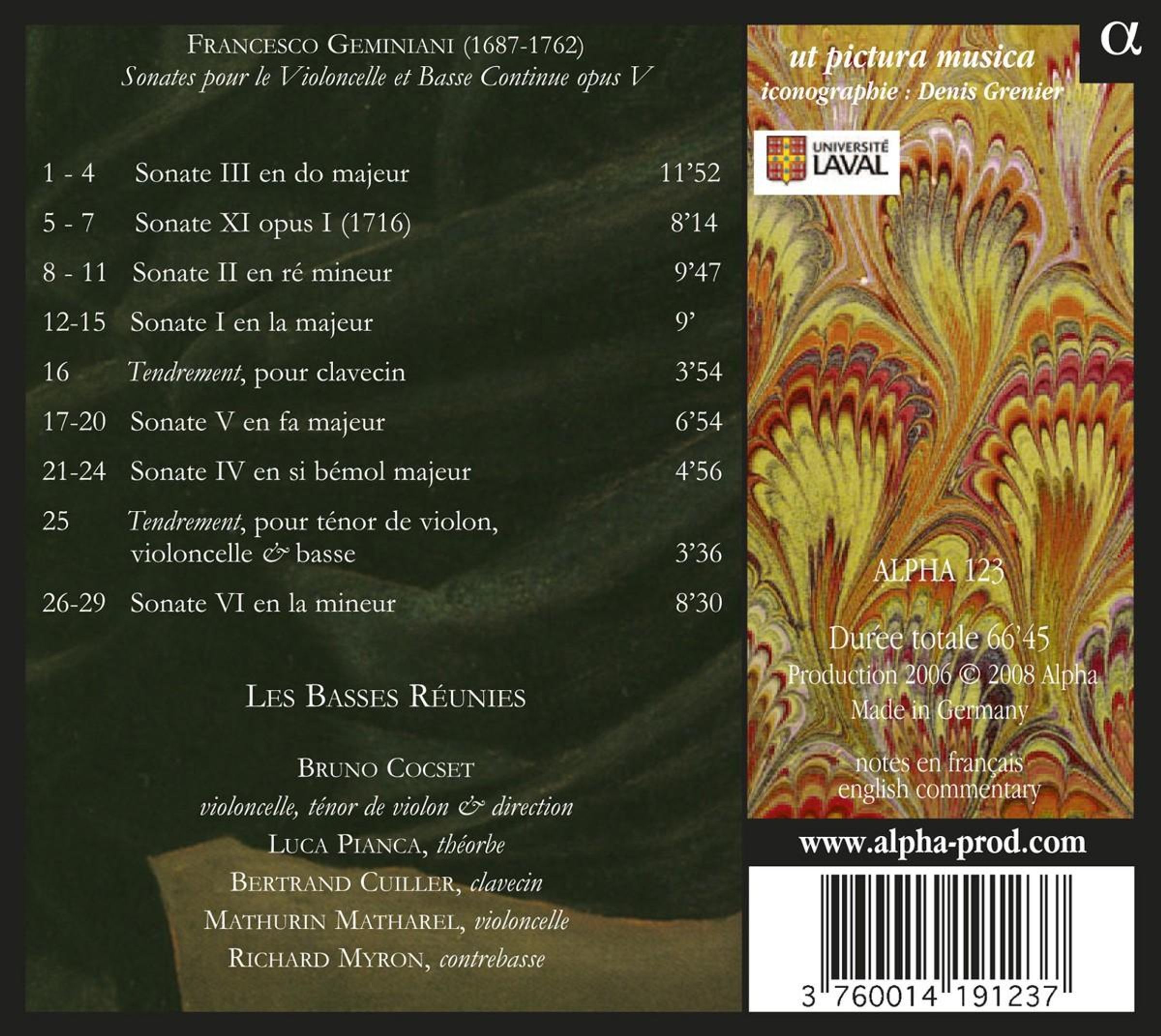 Nach ihren hoch gelobten Aufnahmen mit Cellosonaten von Vivaldi und Barrière auf ALPHA, wenden sich Bruno Coscet und Les Basses Réunies erneut italienischer Musik des 18. Jahrhunderts zu. Die Cellosonaten Op. 5 (1746) des Corelli-Schülers Francesco Geminiani (1687–1762) stehen den bekannteren Sonaten Vivaldis in nichts nach, entsprechen aber eher dem konservativen,»corellisierenden« Geschmack der Engländer. In England lebte Geminiani seit 1714 und prägte, ähnlich wie Händel im Bereich der Oper und des Oratoriums, die Instrumentalmusik Englands.