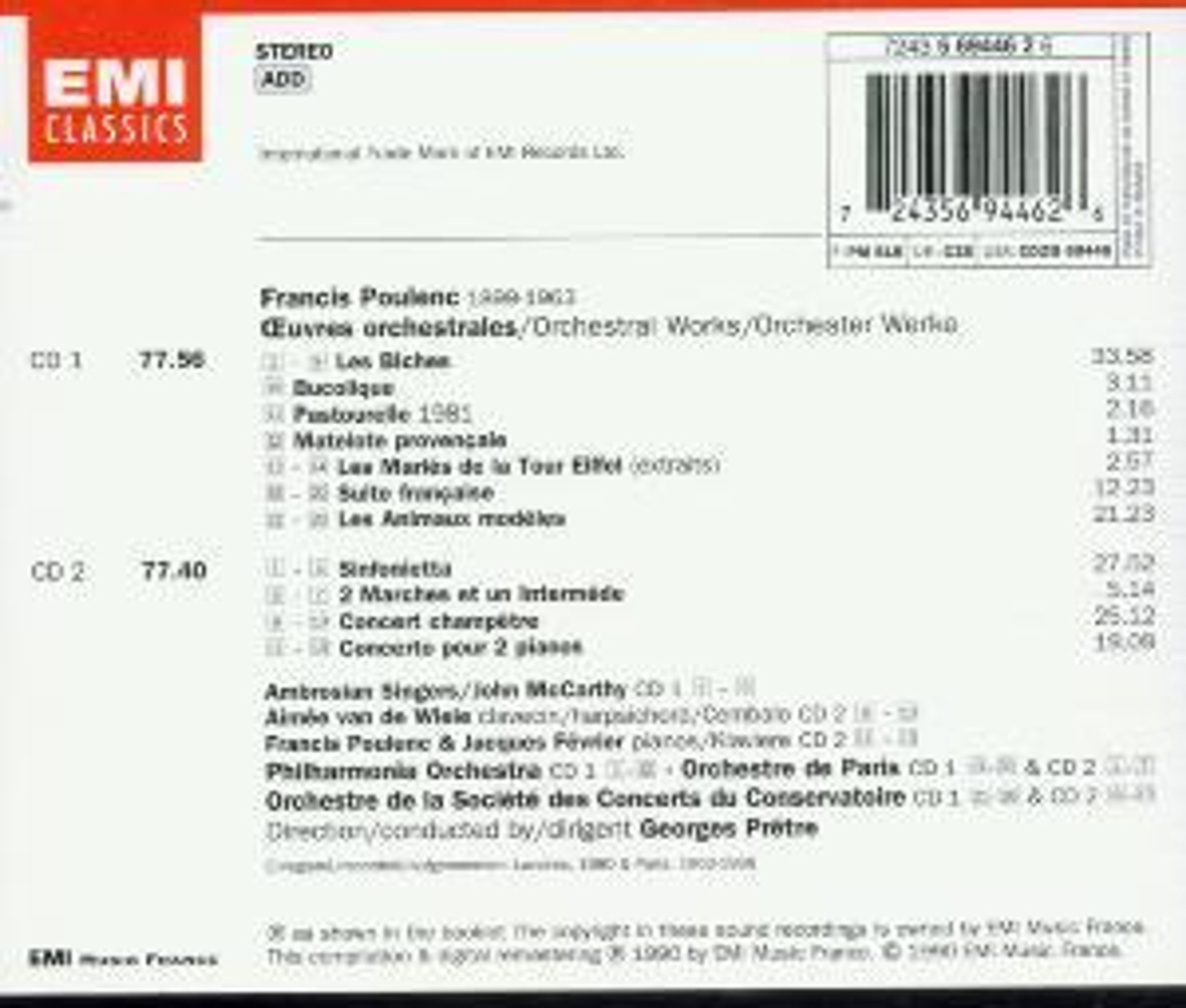 Les Biches; Bucolique; Pastourelle; Matelote provencale; Les Maries de la Tour Eiffel (Ausz.); Les Animaux modeles; Sinfonietta; 2 Marches et un intermede; Concert champetre f. Cembalo & Orchester; Konzert f. 2 Klaviere