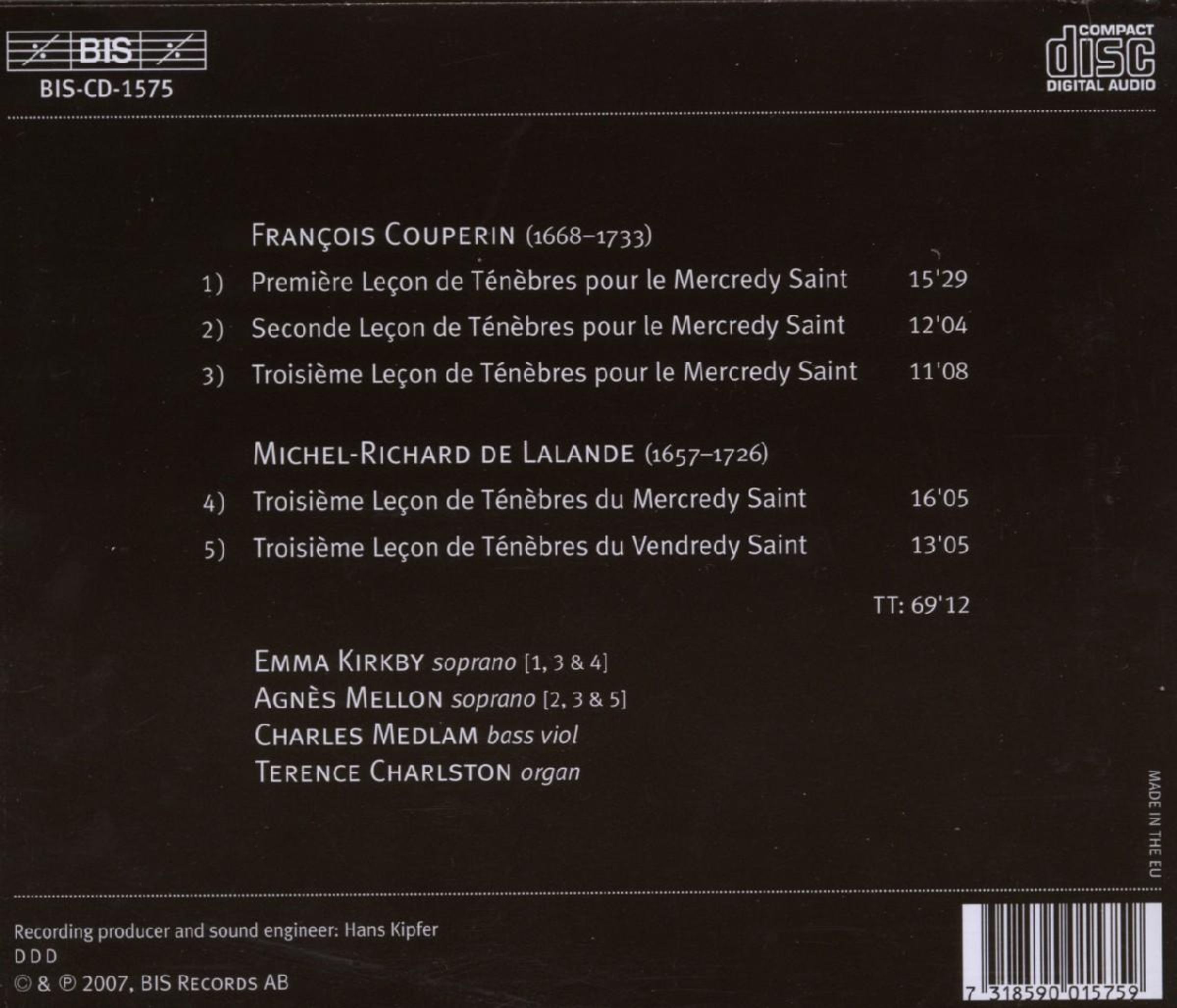 Some of the finest examples of the genre are the three Leçons by François Couperin, composed for the royal monastery of Longchamp c. 1714. (Couperin himself at one time referred to a full set of nine lessons, but only the three for Holy Wednesday are known today.) Couperin, named ‘Organiste du Roi’ in 1693, was the colleague of de Lalande, ‘Maître de Chapelle’ at the French court, whose own Leçons were composed for the royal chapel. The five Leçons de Ténèbres gathered here are performed by two of the finest sopranos in the field of early music, Emma Kirkby and Agnès Mellon, who here makes her first appearance on BIS. They are given expert support by Charles Medlam and Terence Charlston, both members of the distinguished ensemble London Baroque.