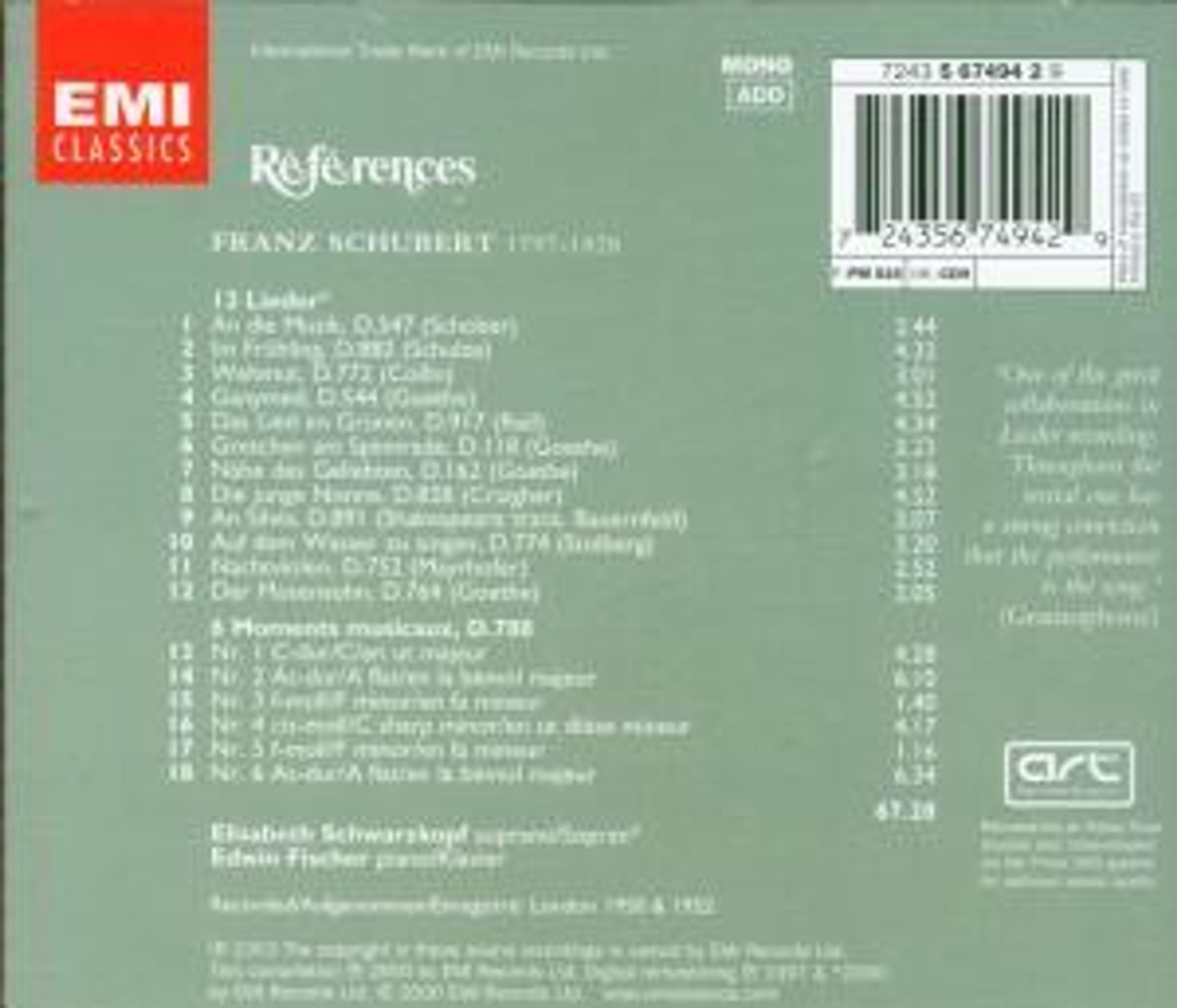 An die Musik; Im Frühling; Wehmut; Ganymed; Lied im Grünen; Gretchen am Spinnrade; Nähe des Geliebten; Die junge Nonne; An Silvia; Auf dem Wasser zu singen; Nachtviolen; Der Musensohn