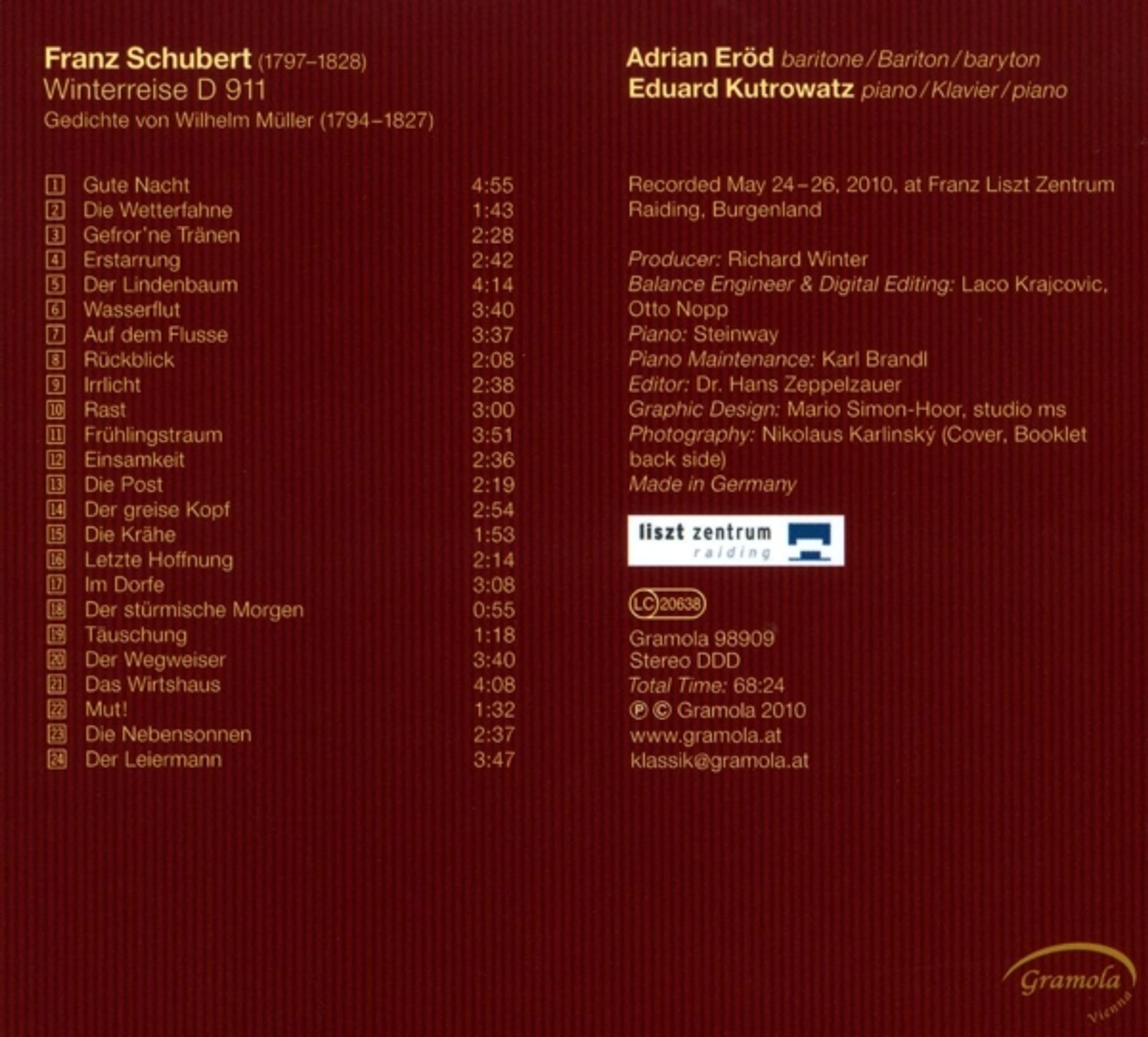 FonoForum 03/11: »Eröd, aufmerksam begleitet von Eduard Kutrowatz, liefert in subtil ausgekosteten lyrischen Schattierungen quasi einen Exkurs über den seelischen Ausnahmezustand des Winterreisenden. Er identifiziert sich nicht unmittelbar mit ihm, macht aus den Liedern auch keine Mini-Opern-Szenen, sondern bietet eher ein Betrachten der ›Bilder einer Ausstellung der Gefühle‹ (wie ein Rezensent einmal über eine andere Einspielung schrieb). Das kann man mögen oder nicht, doch ist es in sich stimmig.«Disk 1 von 1 (CD)