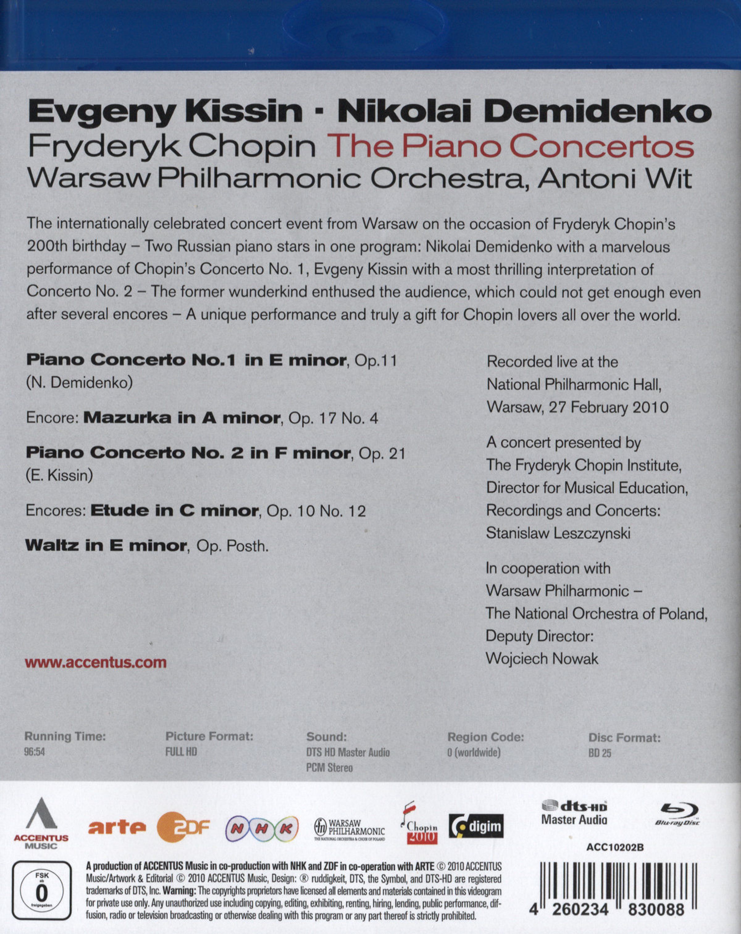 - Nikolai Demidenko (Klavierkonzert Nr. 1 & Mazurka), Evgeny Kissin (Klavierkonzert Nr. 2, Etüde & Walzer), Warsaw Philharmonic Orchestra, Antoni Wit