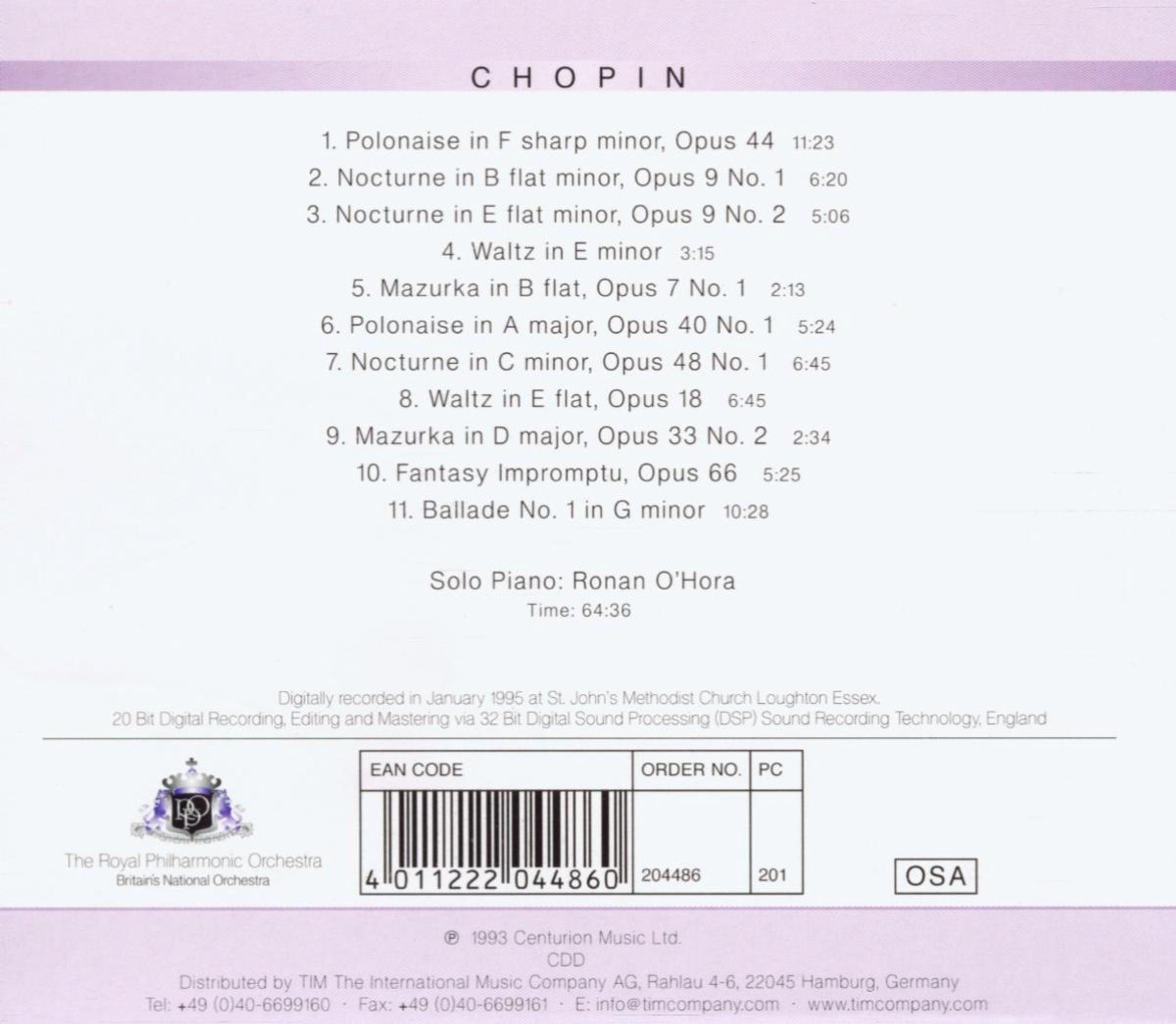 Ballade Nr. 1; Polonaisen Nr. 3 & 5; Nocturnes Nr. 1, 2, 13; Mazurken Nr. 5 & 23; Impromptu Nr. 4; Walzer Nr. 1 & 14