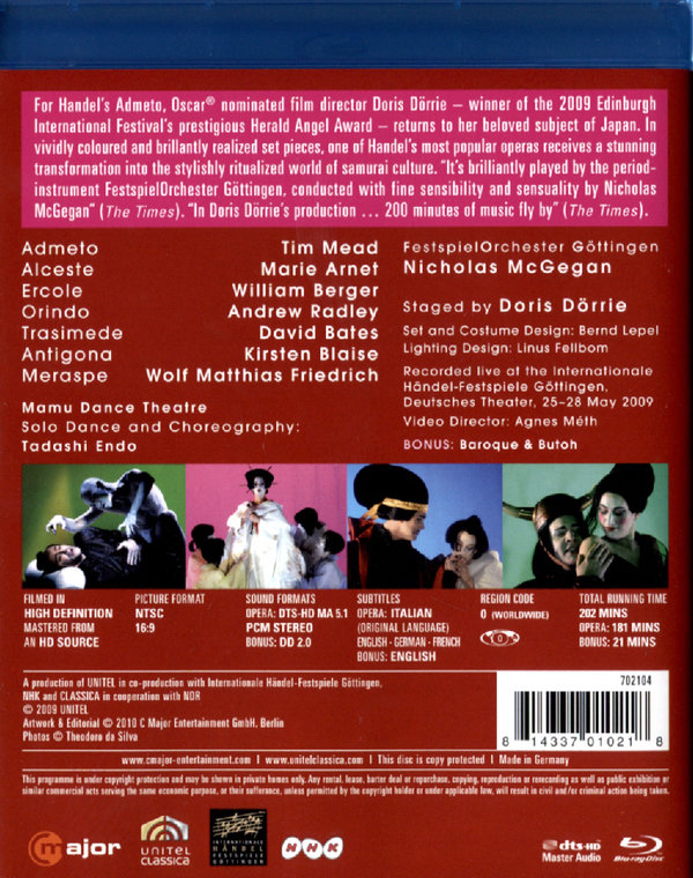 »…Japanischen Butoh-Tanz und europäische Barockmusik hat Regisseurin Doris Dörrie in Händels Oper ›Admeto‹ zusammengefügt. Ihr Ansatz hat sich in der Premiere am Dienstag, 26. Mai, als überraschend stimmig erwiesen. Das Publikum im ausverkauften Deutschen Theater feierte die Inszenierung der Göttinger Händel-Festspiele mit Standing Ovations…« (Göttinger Tageblatt)»Doris Dörrie und Tadashi Endo schufen eine sehr bildgewaltige, üppig ausgestattete und von einem schier nie versiegenden Einfallsreichtum geprägte ›Admeto‹-Inszenierung, die Dank der Energie und Musikalität von Nicholas McGegan und seines Ensembles zu einem großen Festspielereignis wurde.« (omm.de)