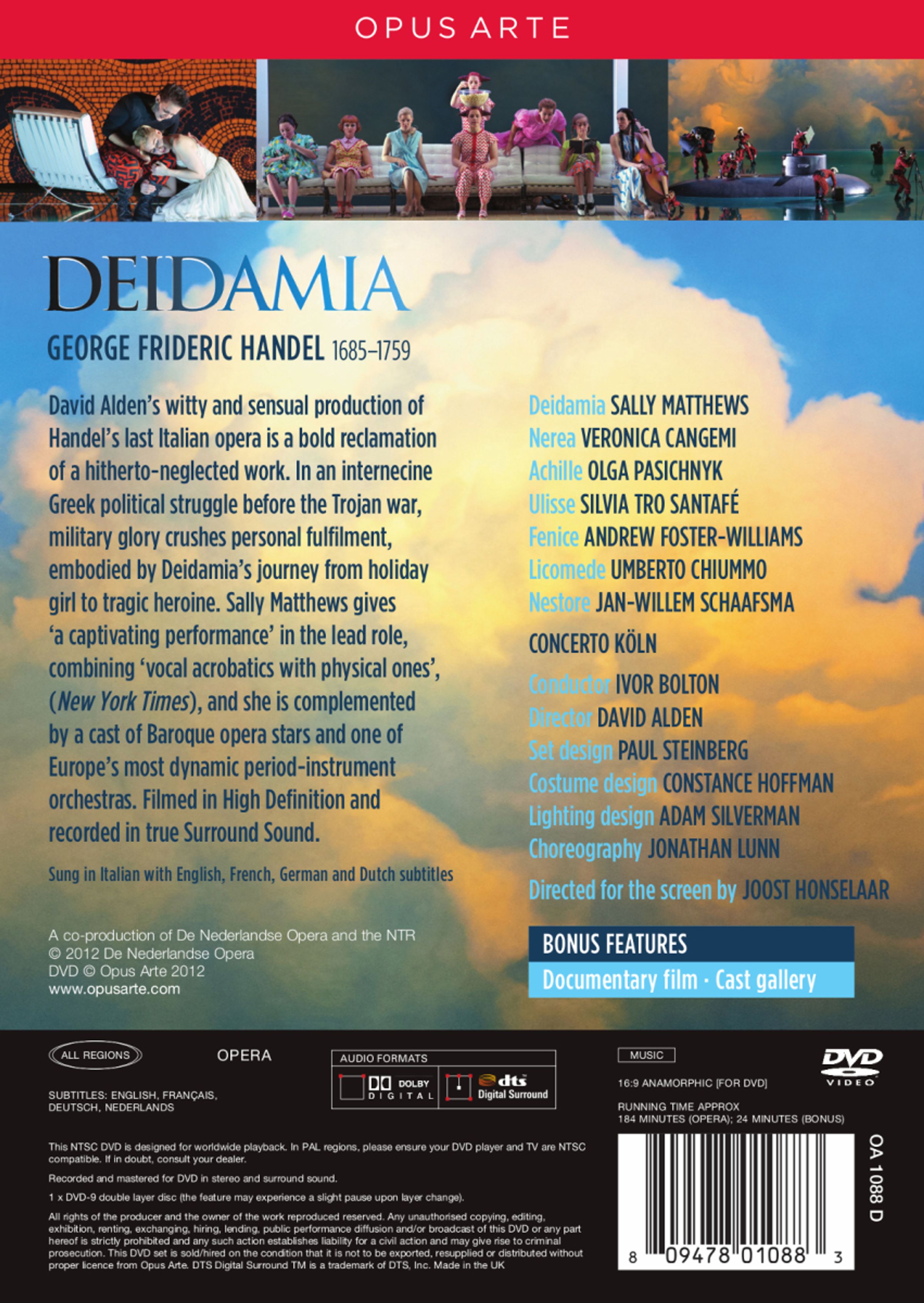 Mit der Neuproduktion der Händel-Oper „Deidamia“ kehrt Concerto Köln ab dem 15. März 2012 für eine Aufführungsserie zurück an die Oper Amsterdam. Damit setzt es seine erfolgreiche Gastspieltätigkeit in Amsterdam fort, die mit der Wiederentdeckung der Oper „L´Ercole amante“ von Francesco Cavalli 2009 fulminant begann. Wie auch schon beim Amsterdamer Debüt vor drei Jahren liegt die musikalische Leitung in den Händen von Ivor Bolton. Die Inszenierung wird ebenfalls wieder von David Alden ausgerichtet. In den Hauptrollen singen Sally Matthews als Deidamia, Olga Pasichnyk als Achille und Silvia Tro Santafé als Ulisse.