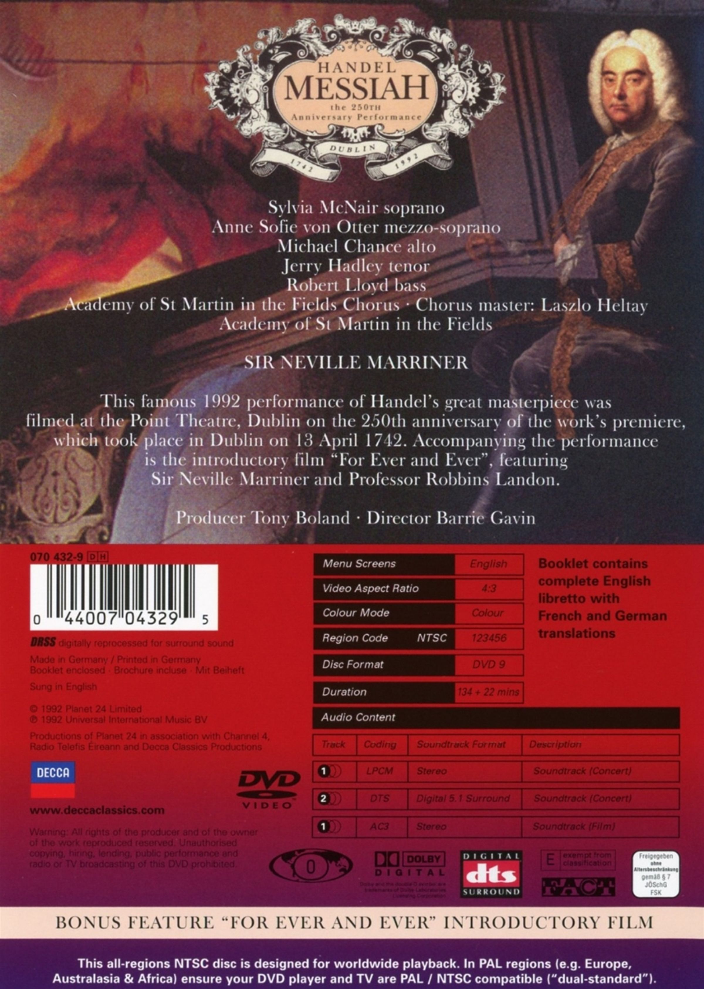 FonoForum 8/93: "Eine konzertante Aufführung von besonderem Stellenwert: das repräsentativ festliche Ereignis der Jubiläumsaufführung in Dublin, wo Händels Messias am 13. April 1742 im Konzertsaal der Fishamble Street zur Uraufführung kam. Exzellent musiziert die Academy of St.Martin-in-the-Fields."Die Hörproben gehören zum Artikel Georg Friedrich Händel (1685-1759): Der Messias (CD). Das Tracklisting kann bei diesem Artikel ggf. abweichen.