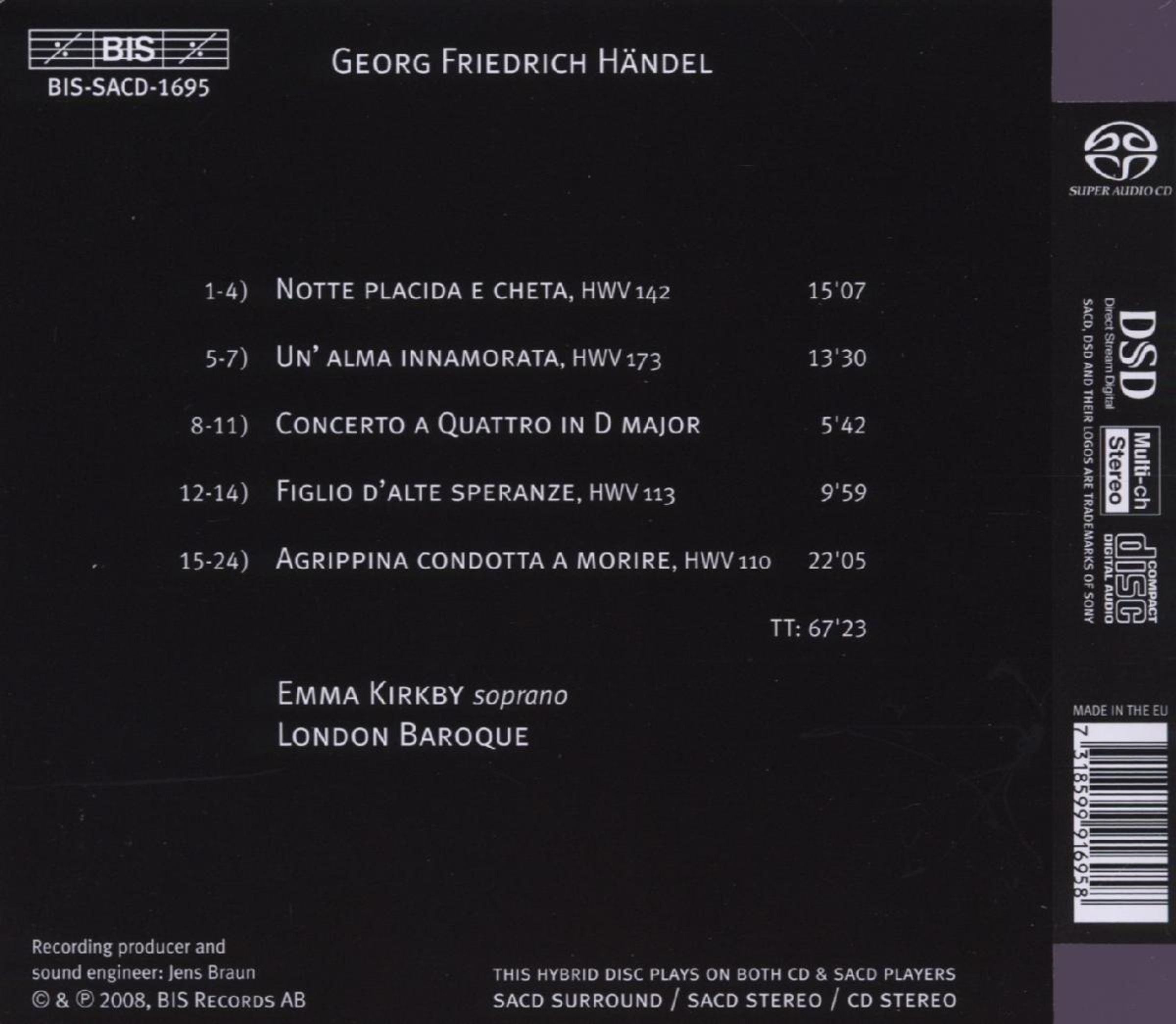 FonoForum 10/08: "Emma Kirkby trägt die Stücke mit tiefer Einsicht in menschliches Denken und Fühlen vor. Ihr Ausdruck ist stark, aber nicht plakativ, und ihre Interaktion mit London Baroque zeugt eindrucksvoll davon, wie ein gemeinsames musikalisches Verständnis in langen Jahren der Zusammenarbeit gereift und gefestigt ist."Disk 1 von 1 (SACD)