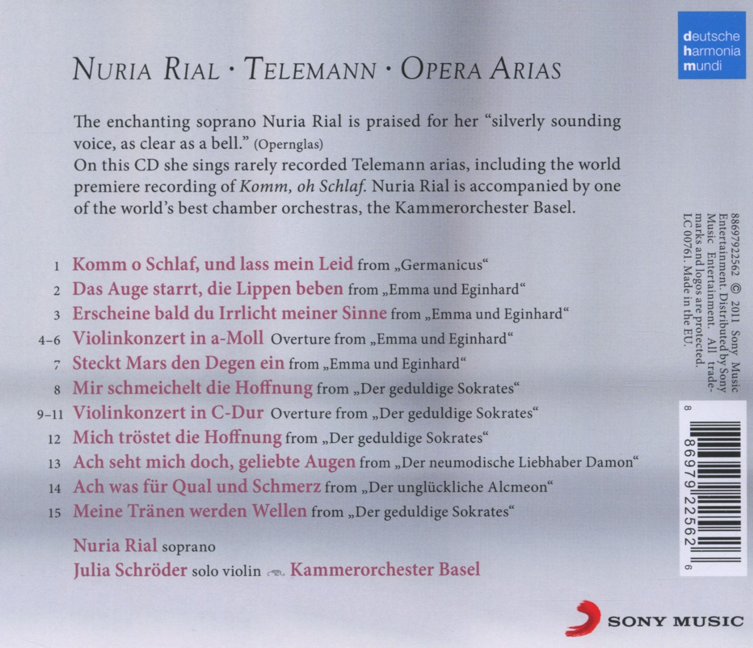 Es scheint, als hätten diese unbekannten Arien aus Telemanns Opern "Emma und Eginhard" und "Der geduldige Sokrates" auf ihre Stimme gewartet. Nuria Rial selbst hat das Programm für ihre neue CD zusammengestellt und präsentiert es mit hinreißender Grazie und beeindruckender Perfektion. Die Arie "Komm, oh Schlaf" aus der Oper "Germanicus" ist eine Weltersteinspielung und bar jeden Zweifels eine große Entdeckung!