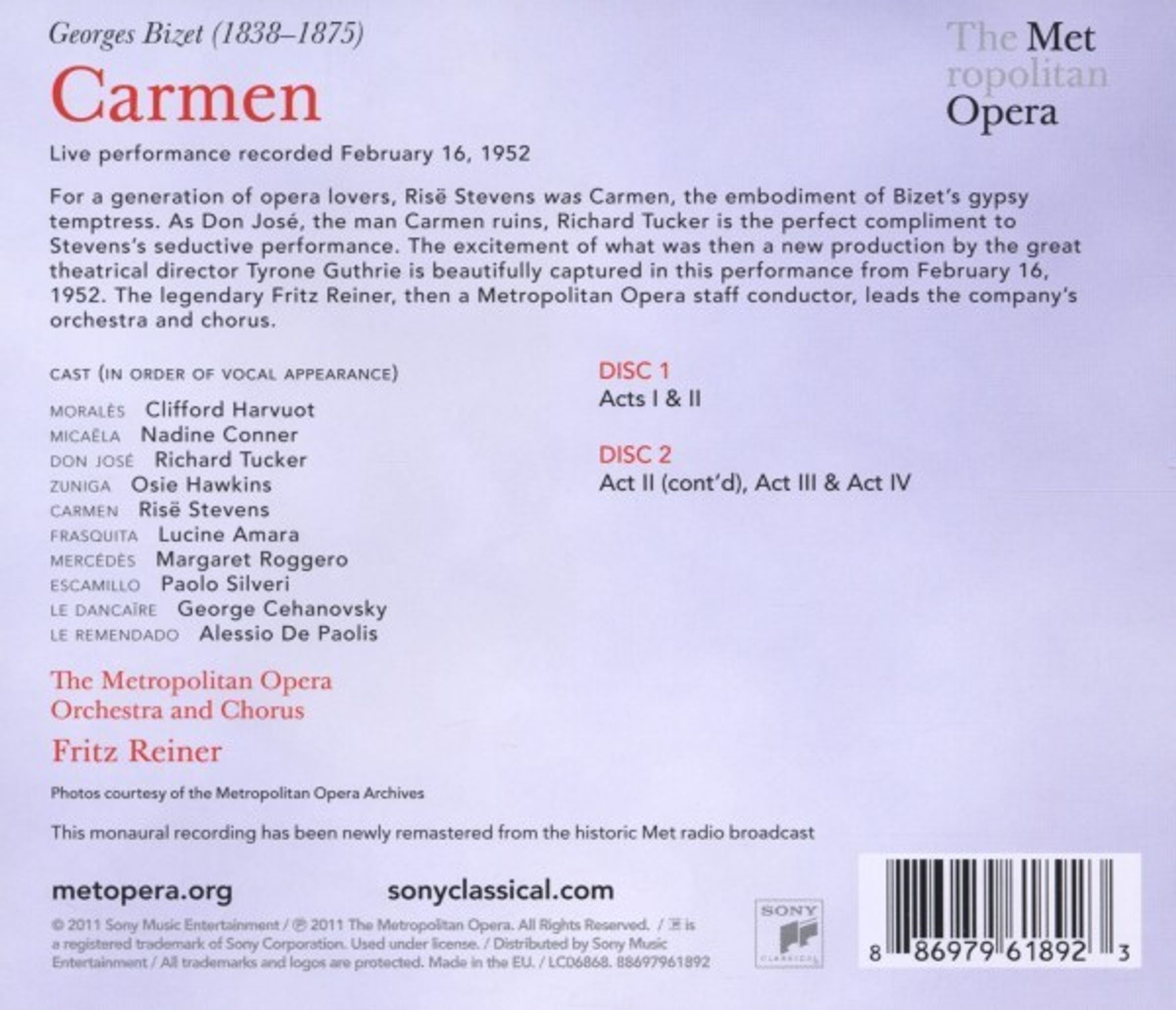 Die Bizetoper "Carmen" wurde am 16. Februar 1952 für die legendären MET Radio Broadcasts live aufgenommen und ausgestrahlt. Fritz Reiner dirigiert das Metropolitan Opera Orchestra. Richard Tucker singt die Rolle des Don José und Rise Stevens brilliert als Carmen.
