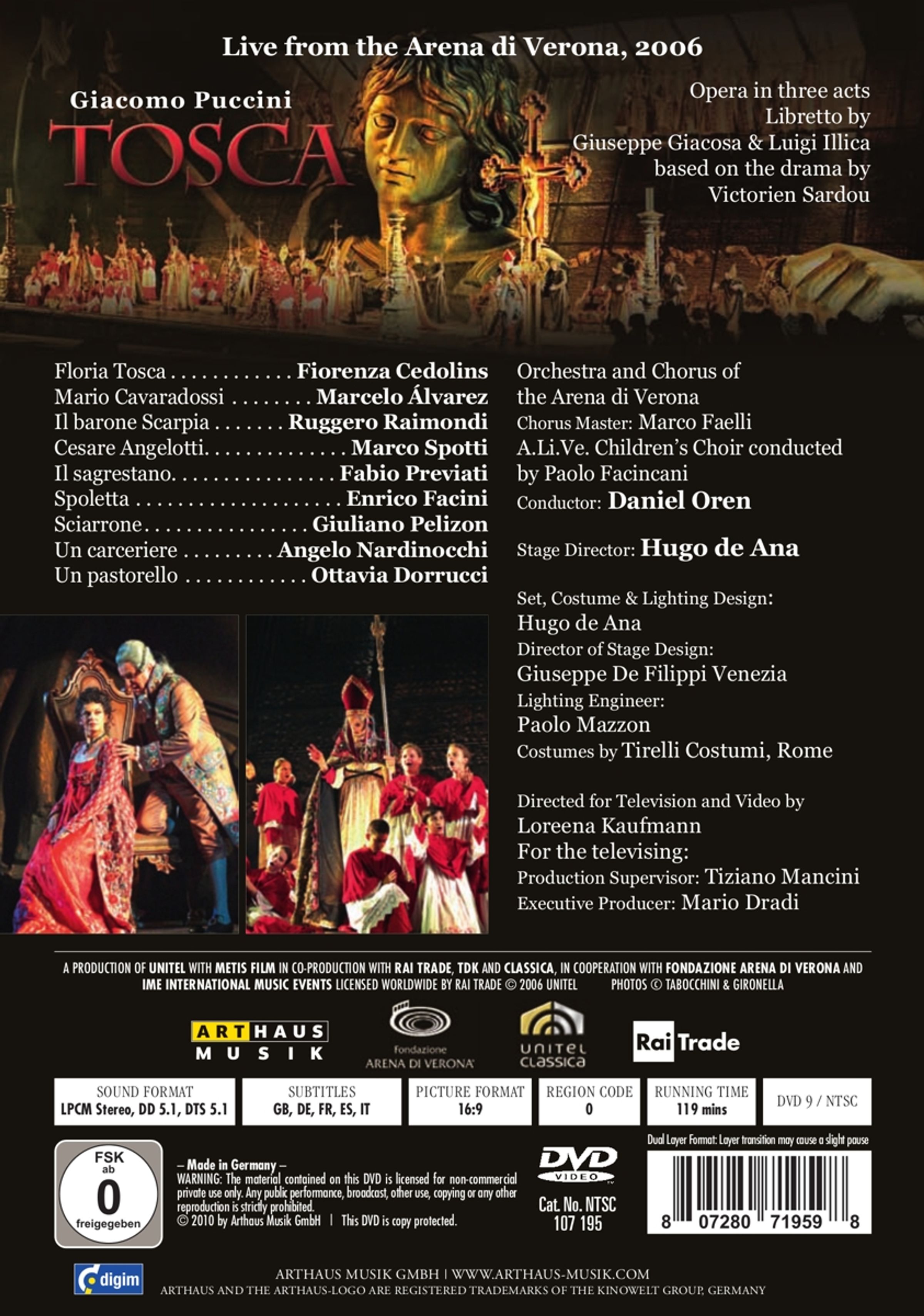 Aus der weltberühmten Arena di Verona kommt diese überragende Inszenierung von Puccinis Oper Tosca. Der italienische Opernproduzent Hugo de Ana setzt das Stück mit aller Pracht in Szene, wie es sich für eine Puccini Oper gehört! Gesungen wird die beliebte Tragödie von einem traumhaften Ensemble. Dirigent ist der in der Arena di Verona schon seit Langem bestehende Daniel Oren. Die Aufnahme hält einen dieser besonderen Sommerabende in Verona fest, an dem das Publikum die Ränge des historischen Ortes in freudiger Erwartung an eine Oper unter freiem Himmel füllt. Das Amphitheater von Verona, auch „die Arena“ genannt, bietet eine stimmungsvolle Kulisse für die Sommerfestspiele. Was für eine beeindruckende Erfahrung, eine Oper in einem ehemaligen Amphitheater zu erleben, das zweitgrößte nach dem Kolosseum in Rom. Die DVD ermöglicht es jedoch, die Bühne und die Schauspieler genauer zu betrachten und schafft es so, diese dramatische Oper direkt zu den Zuschauern nach Hause zu transportieren.