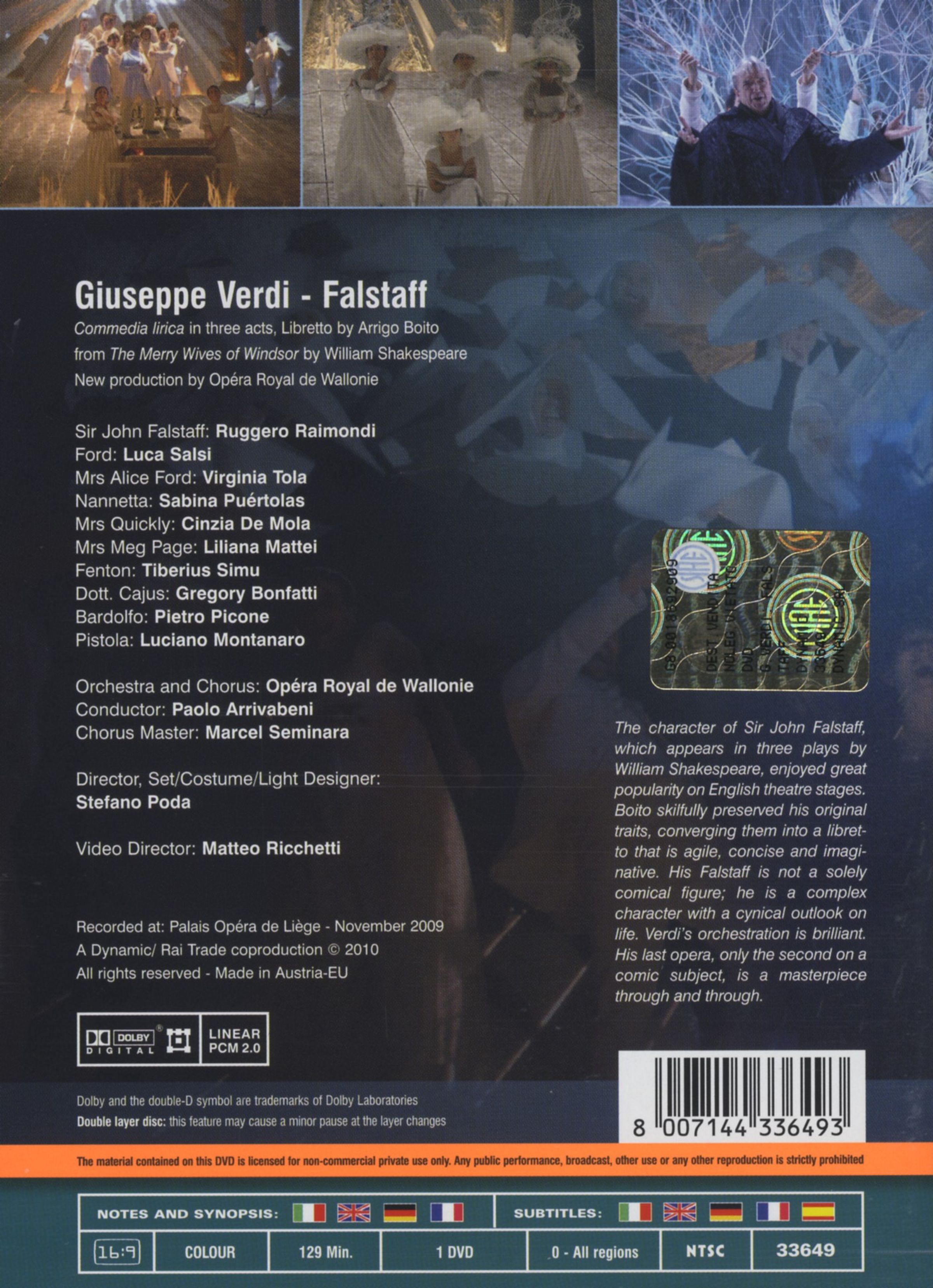 - Ruggero Raimondi, Luca Salsi, Virginia Tola, Sabina Puertolas, Cinzia De Mola, Opera Royal de Wallonie Orchestra, Paolo Arrivabeni