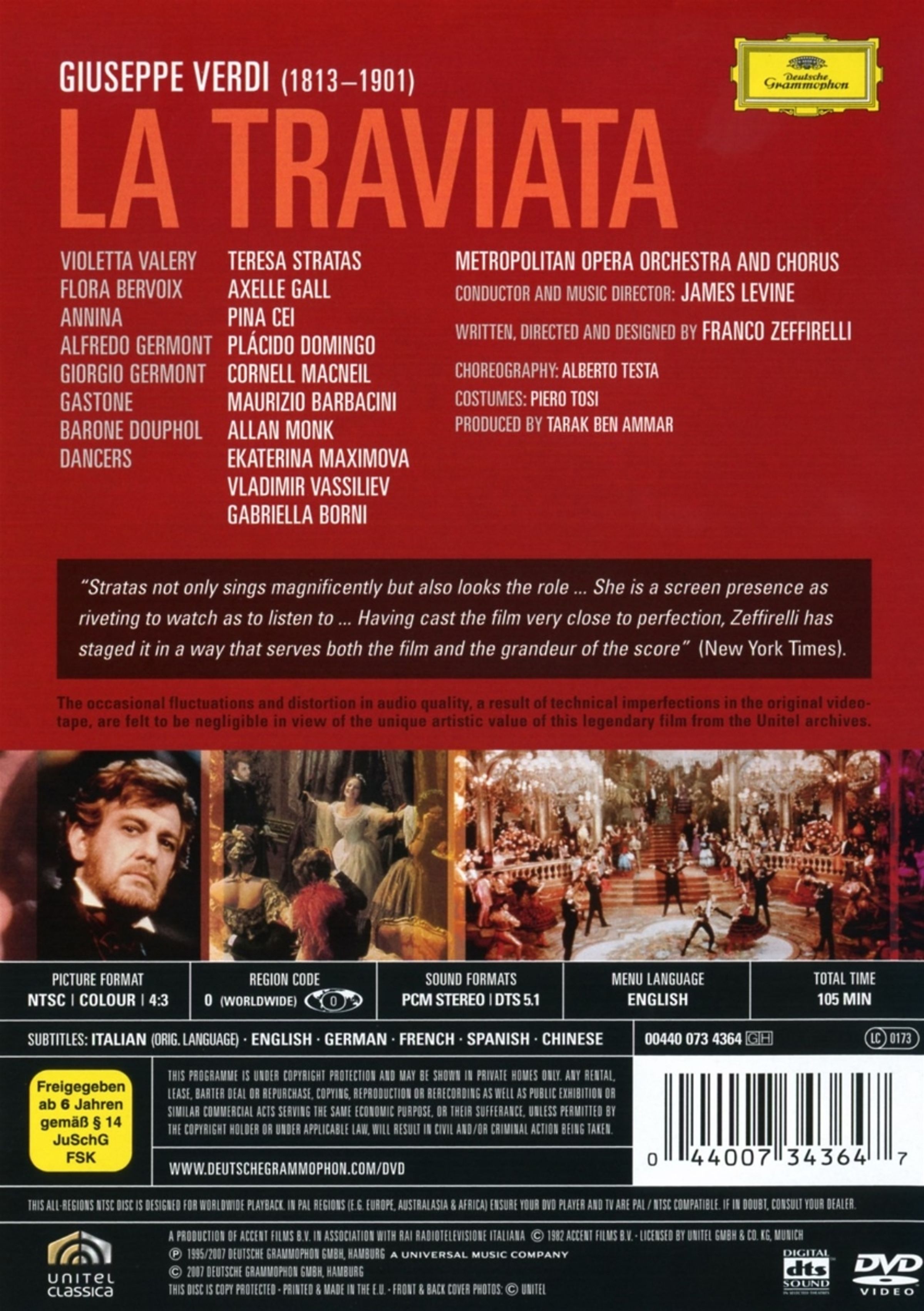 Von Kritikern hoch gelobt wurde diese Produktion aus dem Jahre 1982 zu einer der emotionalsten Interpretationen von Verdis Oper. Unter der musikalischen Leitung von James Levine begleitet das Metropolitan Opera Orchestra Weltstars der Oper wie Plßcido Domingo als Alfredo Germont, Cornell MacNeil als Giorgio Germont und Teresa Stratas als Violetta Valery. Umwerfend... ein Triumph... nicht verpassen. (New York Times)