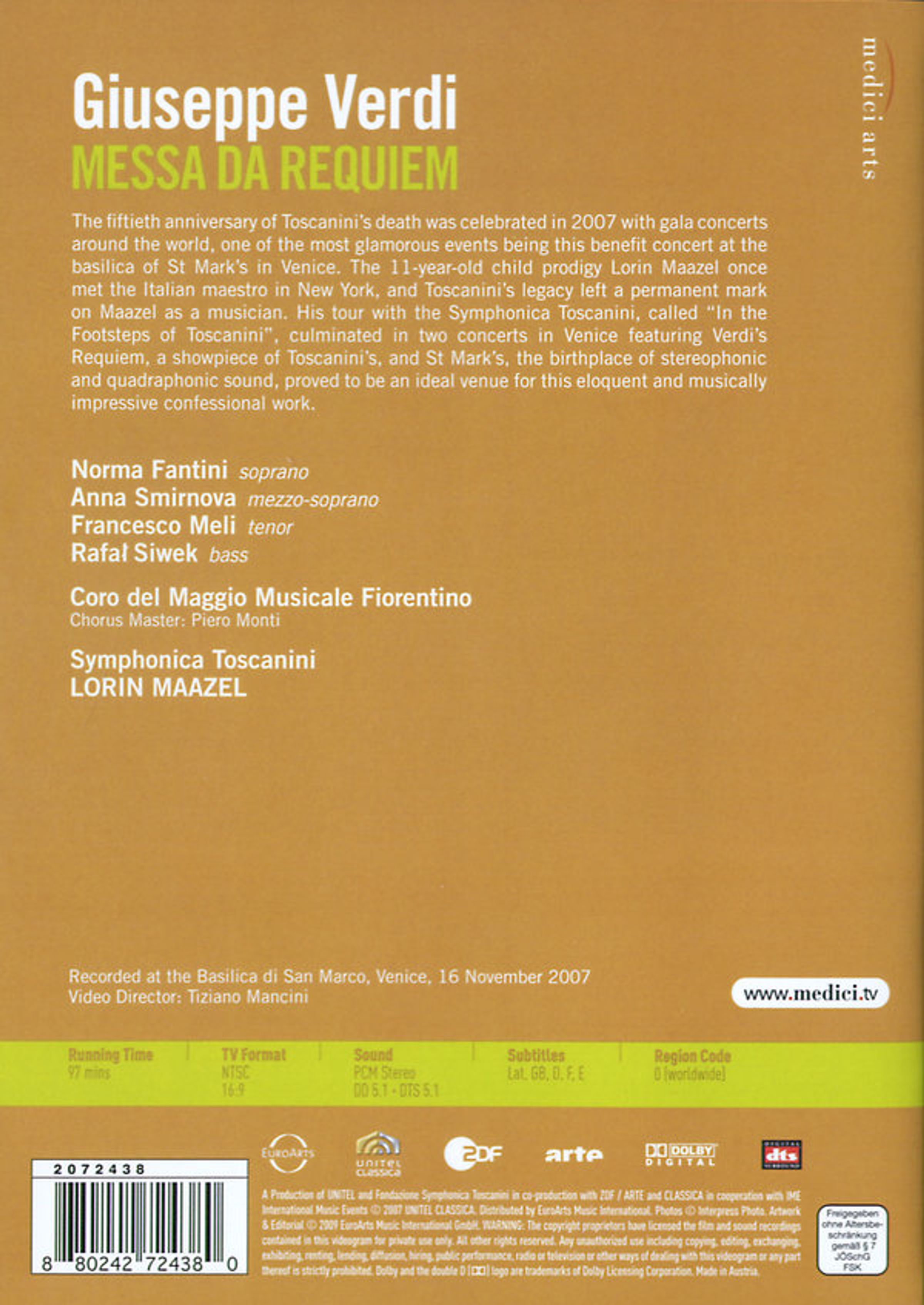Im Jahre 2007 wurde des italienischen Jahrhundert-Maestro Arturo Toscanini, dessen Todestag sich zum 50. Male jährte, in New York mit einer großen Gala gedacht. Der amerikanische Star-Dirigent Lorin Maazel war Toscanini 1947 begegnet und durfte damals mit nur 11 Jahren dessen NBC Symphony Orchestra leiten. Auf dieser DVD leitet Maazel die 2006 in Rom gegründete Symphonica Toscanini, die 2007 mit der Messa da Requiem die Toscanini-Referenz mit zwei Konzerten in Venedig krönte. Die Basilika des Markusdomes ist von ihren akustischen Verhältnissen ideal für das wort- und tongewaltige Werk Verdis. Maazel gelingt es, in diesem, dem Dichter Alessandro Manzoni gewidmeten, geistlichen Werk, den allgegenwärtigen Gestus der Menschlichkeit durch sein Gespür für die lyrischen Ausdrucksskalen und die fulminanten Spannungen im Orchesterpanorama greifbar zu machen. Dazu hat er sich mit Norma Fantini, Anna Smirnova, Francesco Meli und Rafal Siwek vier ausgezeichnete Sänger aus dem Opernfach eingeladen.
