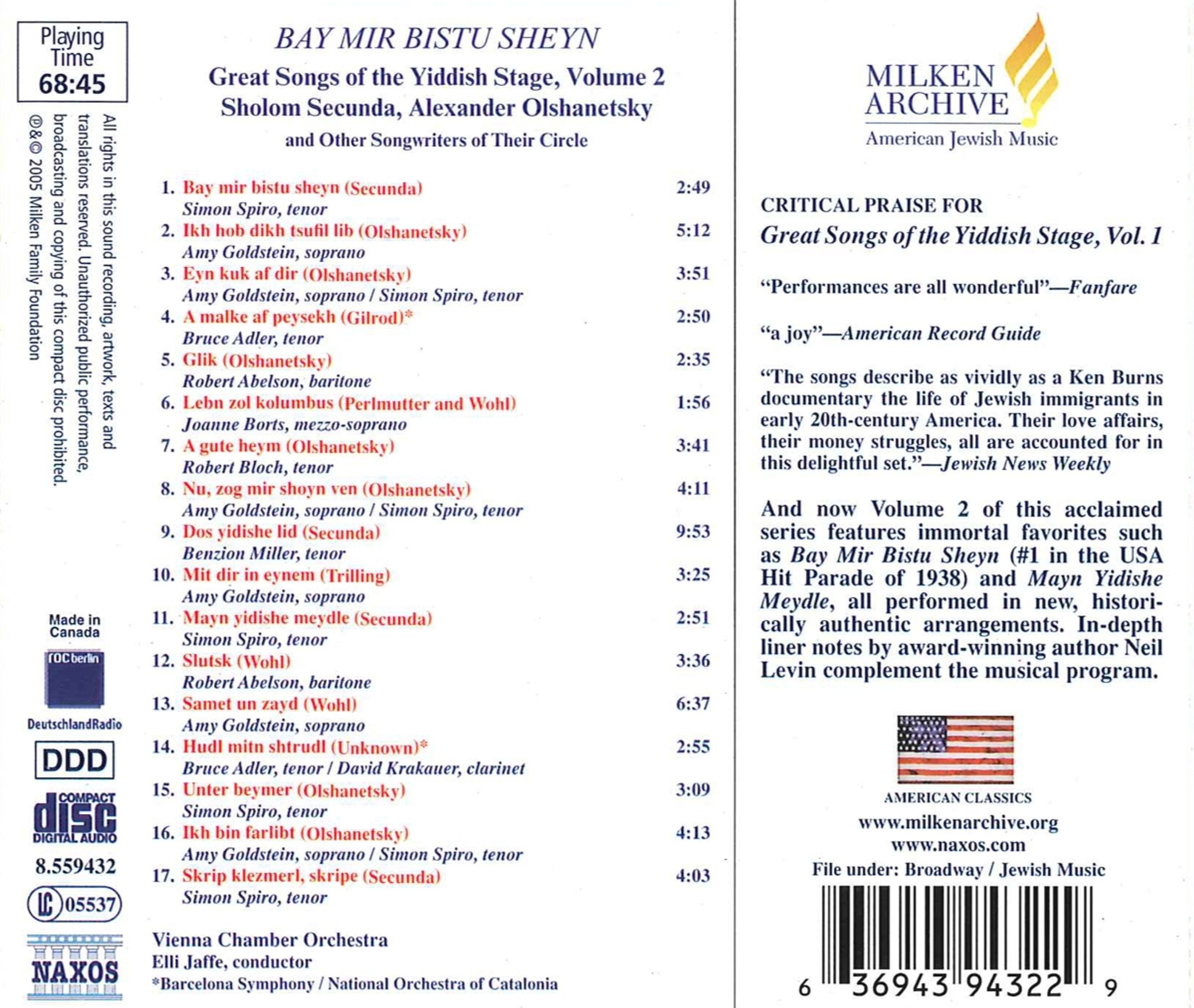 Dieses Album enthält eine Sammlung jiddischer Lieder, aufgeführt von verschiedenen Künstlern, mit dem Wiener Kammerorchester und dem Barcelona Symphony Orchestra unter der Leitung von Elli Jaffe