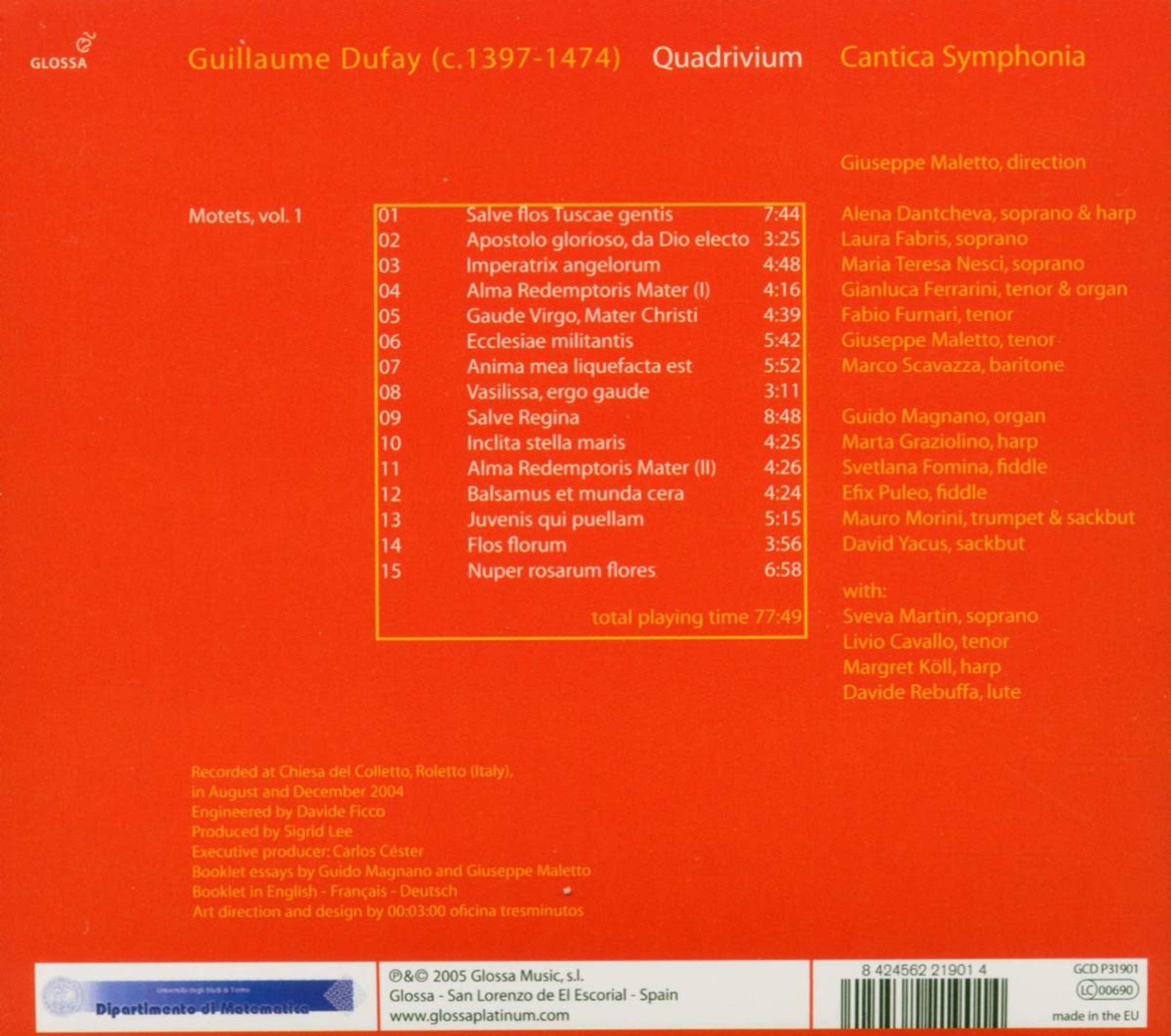 Salve flos Tuscae gentis; Apostolo glorioso, da Dio electo; Imperatrix angelorum; Alma Redemptoris Mater I & II; Gaude Virgo, Mater Christi; Ecclesiae militantis; Anima mea liquefacta est; Vasilissa, ergo gaude; Salve Regina; Inclita stella maris; Balsamus et munda cera; Juvenis qui puellam; Flos florum; Nuper rosarum flores