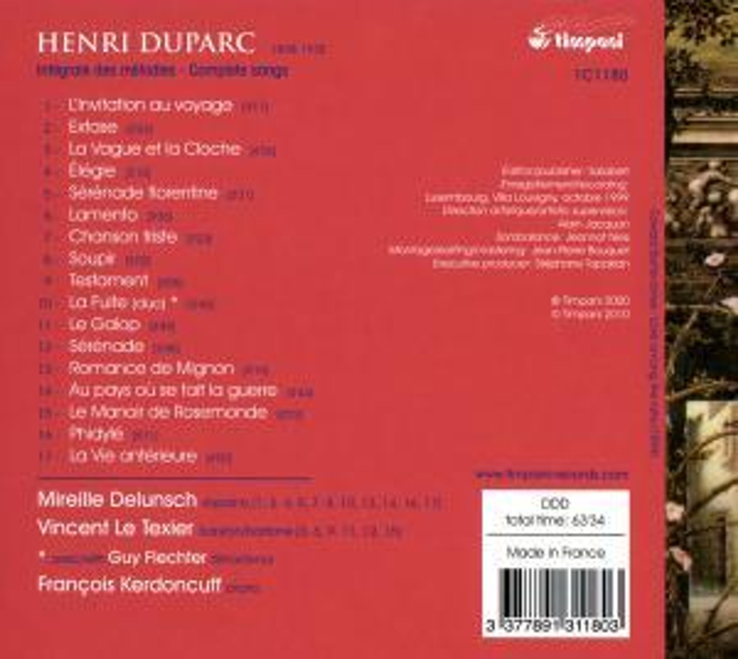 Mit seinen Liedern beeinflusste Henri Duparc (1848-1933) nachhaltig das Musikleben Frankreichs in der zweiten Hälfte des 19. Jahrhunderts. Duparcs OEuvre ist sehr schmal, da er bereits 1885 wegen einer Neurasthenie das Komponieren aufgeben musste und außerdem als überkritischer Künstler viele seiner Werke vernichtete. Seine Lieder stellen einen außerordentlich qualitätsvollen Beitrag zum französischen Lied dar, nicht zuletzt weil er primär die Texte namhafter Dichter wie Baudelaire und Gautier vertonte. Seine zahlreichen Umarbeitungen und Revisionen belegen zusätzlich, dass diese Lieder eben keine gefälligen Salonromanzen mehr sind, sondern vollgültige Kunstwerke. In Mireille Delunsch, Vincent Le Texier und François Kerdoncuff fi nden die Lieder Duparcs mehr als nur adäquate Interpreten, die die Schönheit dieser kostbaren Musik zu unterstreichen und zu vermitteln wissen.