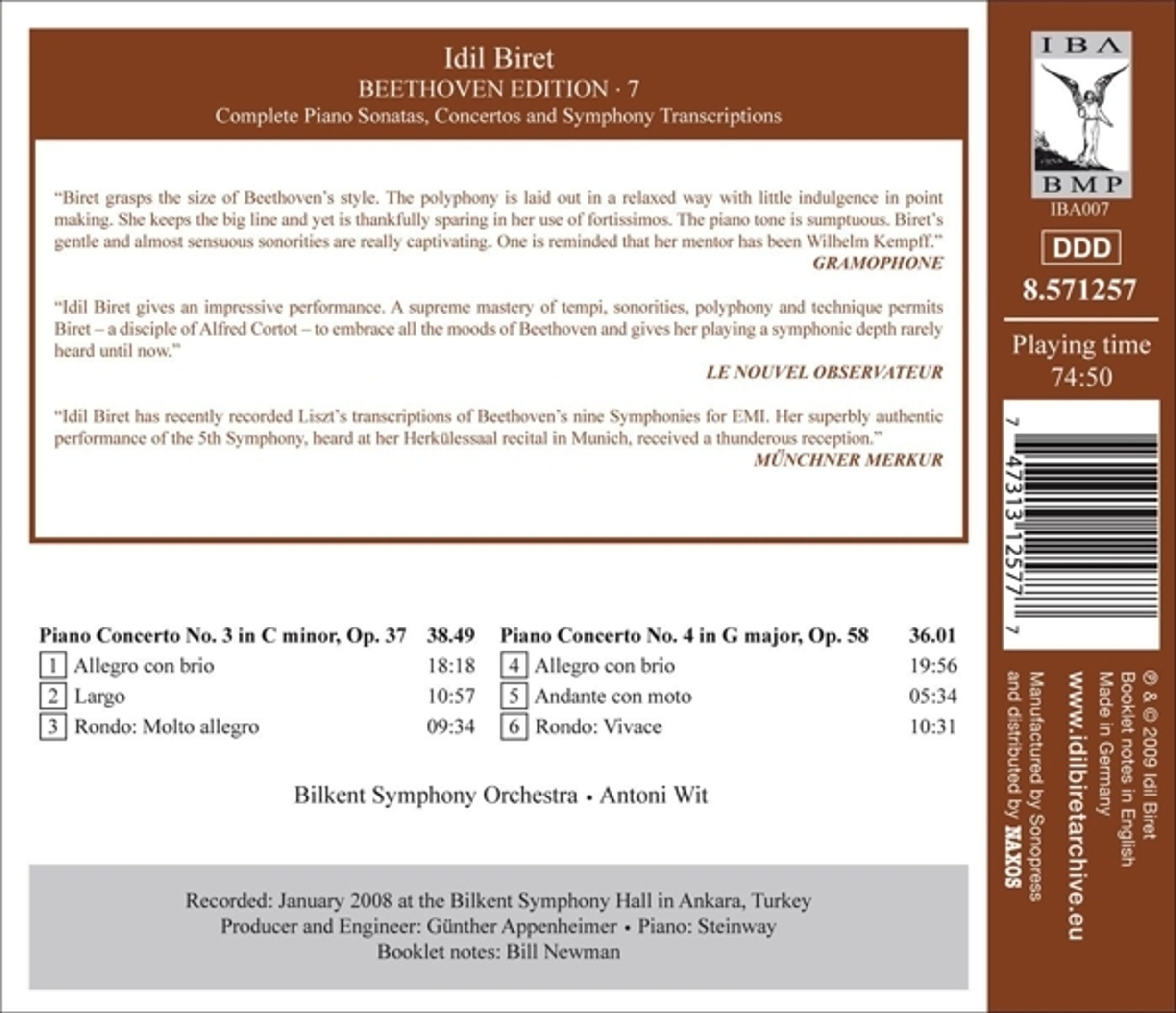 "Biret grasps the size of Beethoven's style. The polyphony is laid out in a relaxed way with little indulgence in point making. She keeps the big line and yet is thankfully sparing in her use of fortissimos. The piano tone is sumptuous. Biret's gentle and almost sensuous sonorities are really captivating. One is reminded that her mentor has been Wilhelm Kempff." (Gramophone) "Idil Biret gives an impressive performance. A supreme mastery of tempi, sonorities, polyphony and technique permits Biret-a disciple of Alfred Cortot-to embrace all the moods of Beethoven and gives her playing a symphonic depth rarely heard until now." (Le Nouvel Observateur) "Idil Biret has recently recorded Liszt's transcriptions of Beethoven's nine Symphonies for EMI. Her superbly authentic performance of the 5th Symphony, heard at her Herkülessaal recital in Munich, received a thunderous reception." (Müncher Merkur)"