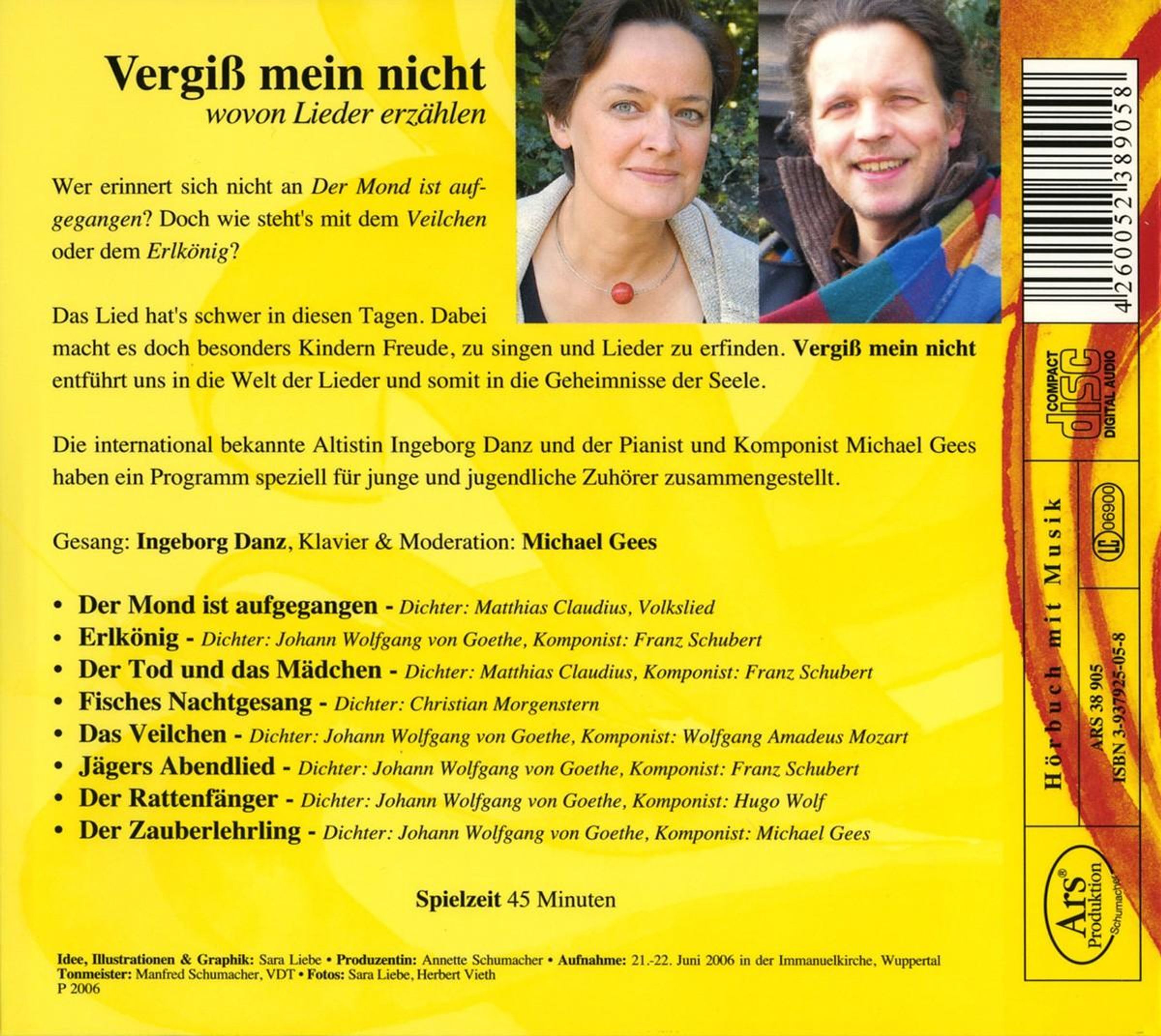 Wer erinnert sich nicht an »Der Mond ist aufgegangen«? Doch wie stehts mit dem »Veilchen« oder dem »Erlkönig«? Das Lied hats schwer in diesen Tagen. Dabei macht es doch besonders Kindern Freude, zu singen und Lieder zu erfinden. »Vergiß mein nicht« entführt uns in die Welt der Lieder und somit in die Geheimnisse der Seele. Die international bekannte Altistin Ingeborg Danz und der Pianist und Komponist Michael Gees haben ein Programm speziell für junge und jugendliche Zuhörer zusammengestellt.
