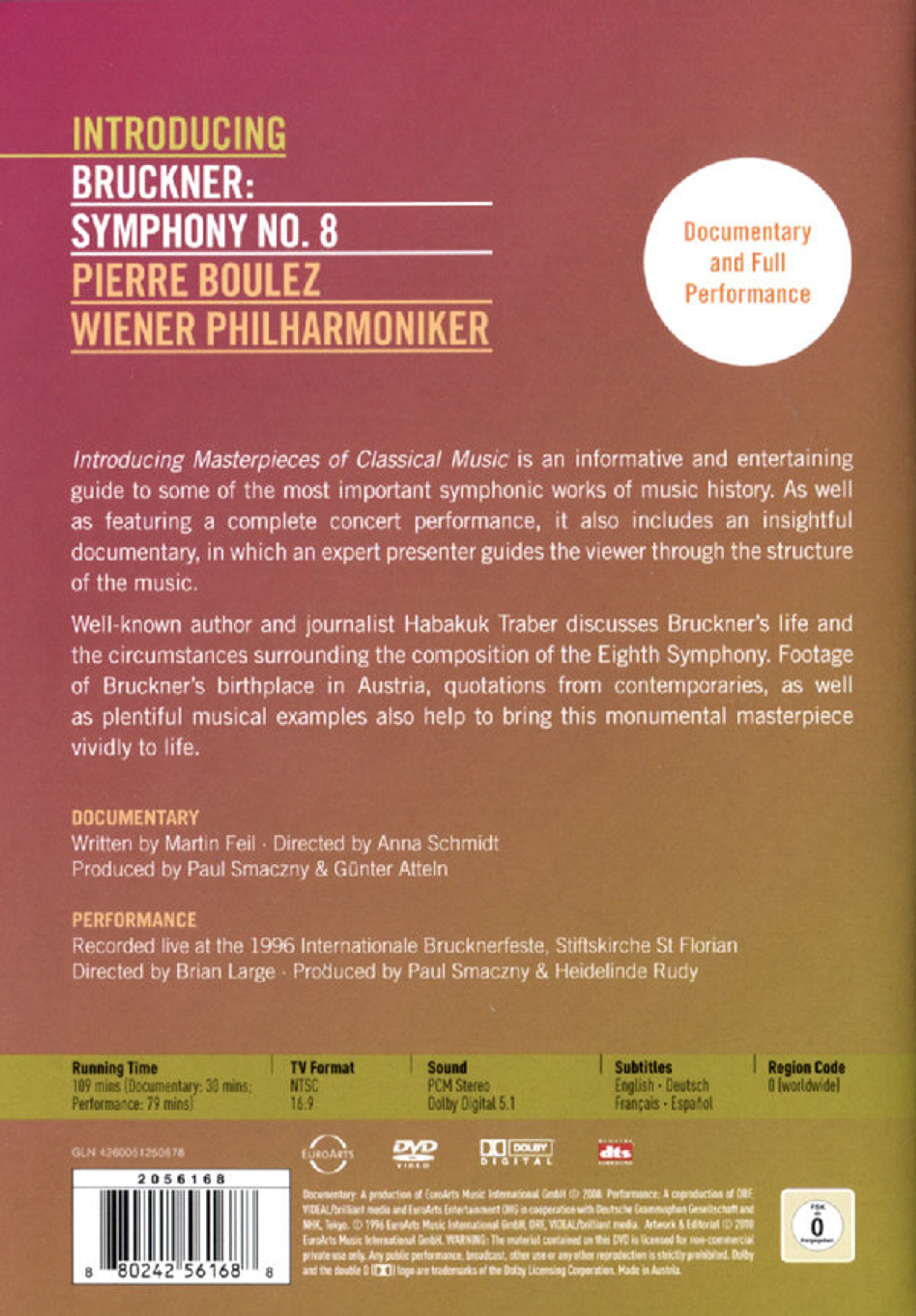Die Serie "Introducing" eröffnet einen völlig neuen Weg, große Meisterwerke der Musikgeschichte - vom Barock bis zur Moderne - zu entdecken und zu erleben. Jede Folge des audio-visuellen Konzertführers enthält eine umfangreiche Dokumentation sowie eine Komplettaufführung des jeweiligen Werkes. In dieser Veröffentlichung wird Bruckner 8. Symphonie präsentiert.