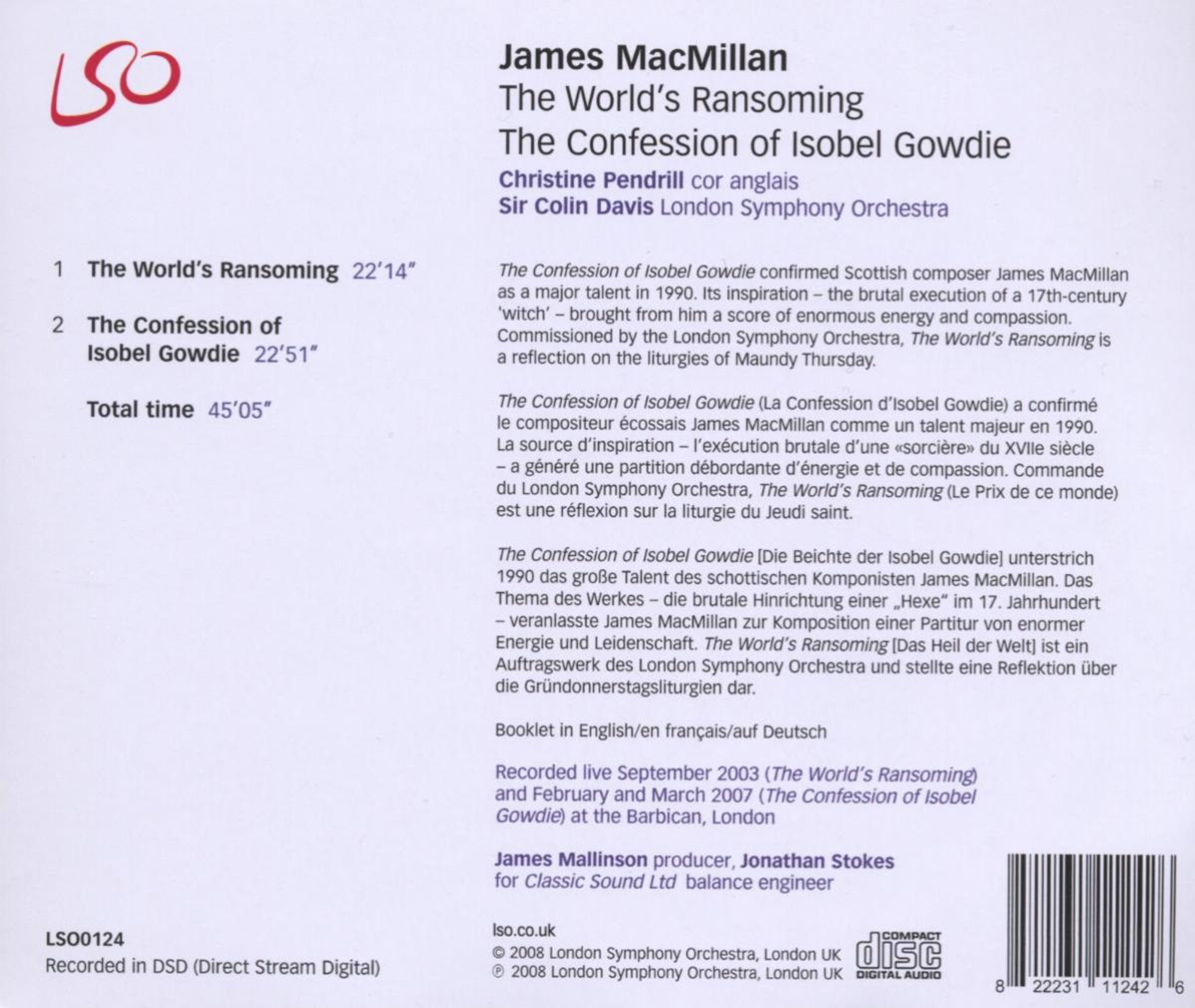 Der schottische Komponist und Dirigent James MacMillan hatte seinen internationalen Durchbruch mit dem Orchesterwerk The Confession of Isobel Gowdie, das 1990 vom BBC Scottish Symphony Orchestra bei den Londoner Proms uraufgeführt wurde. Das Werk handelt von Isobel Gowdie, die 1662 während des Hexenwahns in Schottland als Hexe verbrannt wurde. Nach den Worten des Komponisten ist das Werk das Requiem, das die junge Frau niemals bekam. The World's Ransoming (1995 / 96) ist ein Auftragswerk des LSO. Es ist eine fesselnde Reflektion über die Gründonnerstagliturgie. MacMillans anhaltender Erfolg als Komponist gründet sich nicht zuletzt in der Zugänglichkeit seiner musikalischen Sprache, die ihre Wurzeln in der traditionellen Musik Schottlands hat.