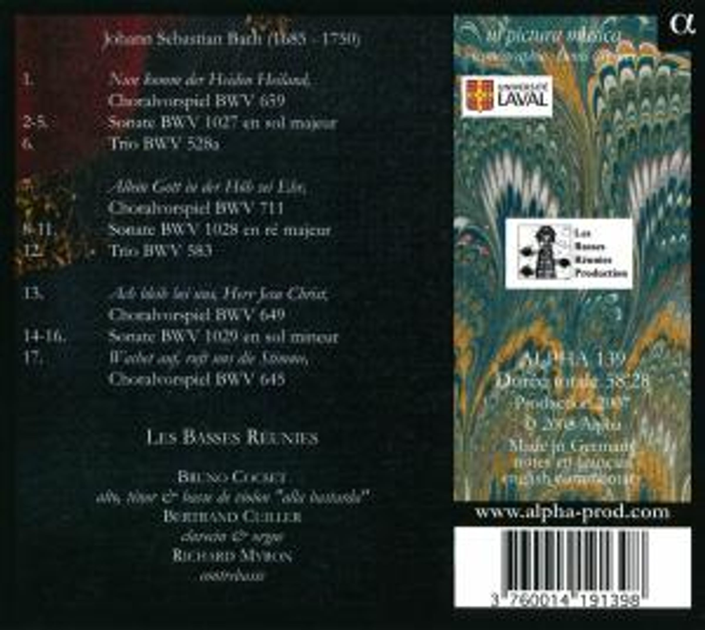 Bei Bach können die Grenzen zwischen geistlicher und weltlicher Musik bekanntlich fließend sein. Bruno Cocset und Les Basses Réunies belegen dies anhand der Sonaten BWV 1027–1029, denen sie einige Choralbearbeitungen zur Seite stellen. Für die Einspielung hat sich Cocset bei dem Instrumentenmacher Charles Richie eigens ein neues Instrument fertigen lassen. Halb Viola und halb Violine ist es gleichermaßen für virtuoses wie polyphones Spiel geeignet und offenbart seine Vorzüge bei dem hier eingespielten Repertoire. Inspirieren ließ man sich dabei von einem Gemälde Bartolomeo Betteras. Einmal mehr bewahrheitet sich damit der Leitspruch von ALPHA: ut pictura musica, Musik und Malerei sind eins.