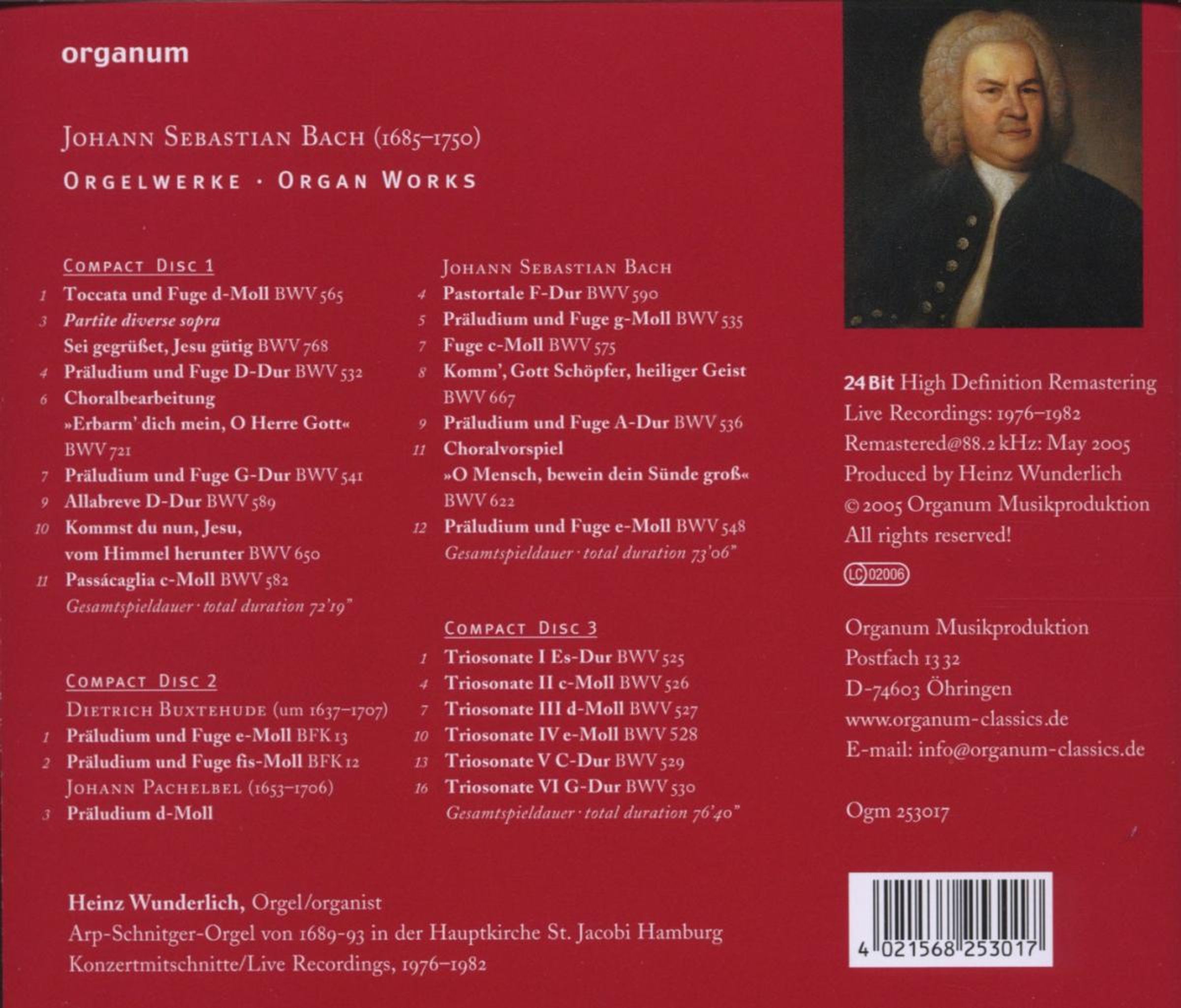 Toccata & Fuge BWV 565; Präludien & Fugen BWV 532, 535, 536, 541, 548; Choräle BWV 622, 650, 667, 721; Fuge BWV 575; Partita BWV 768; Pastorale BWV 590; Allabreve BWV 589; Passacaglia BWV 582; Triosonaten BWV 525-530