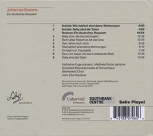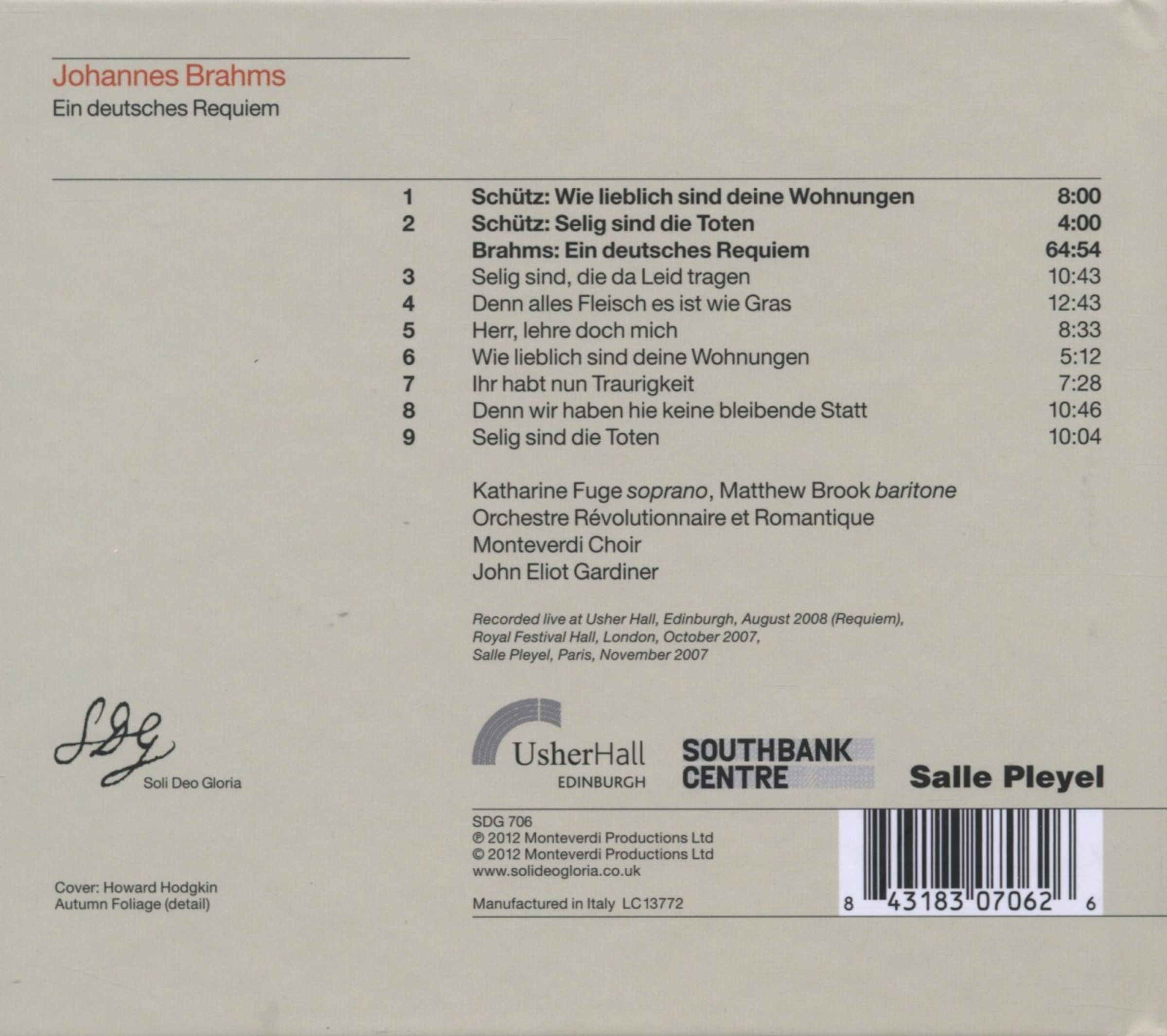 Die am 19. August 2008 mitgeschnittene Live-Aufnahme von »Ein deutsches Requiem« beendet die Reihe von Brahms Einspielungen bei SDG. War es Gardiners ausdrückliches Ziel, die Sinfonien von Brahms »im Kontext seiner eigenen wunderbaren und häufig vernachlässigten Chormusik sowie der Chorwerke der von ihm besonders geschätzten alten Meister (speziell Schütz und Bach) und der Helden der neueren Zeit (Mendelssohn, Schubert und Schumann) anzusiedeln«, so erscheinen auch hier zwei Motetten von Heinrich Schütz, deren Texte auch Brahms in seinem »deutschen Requiem« vertont hat.