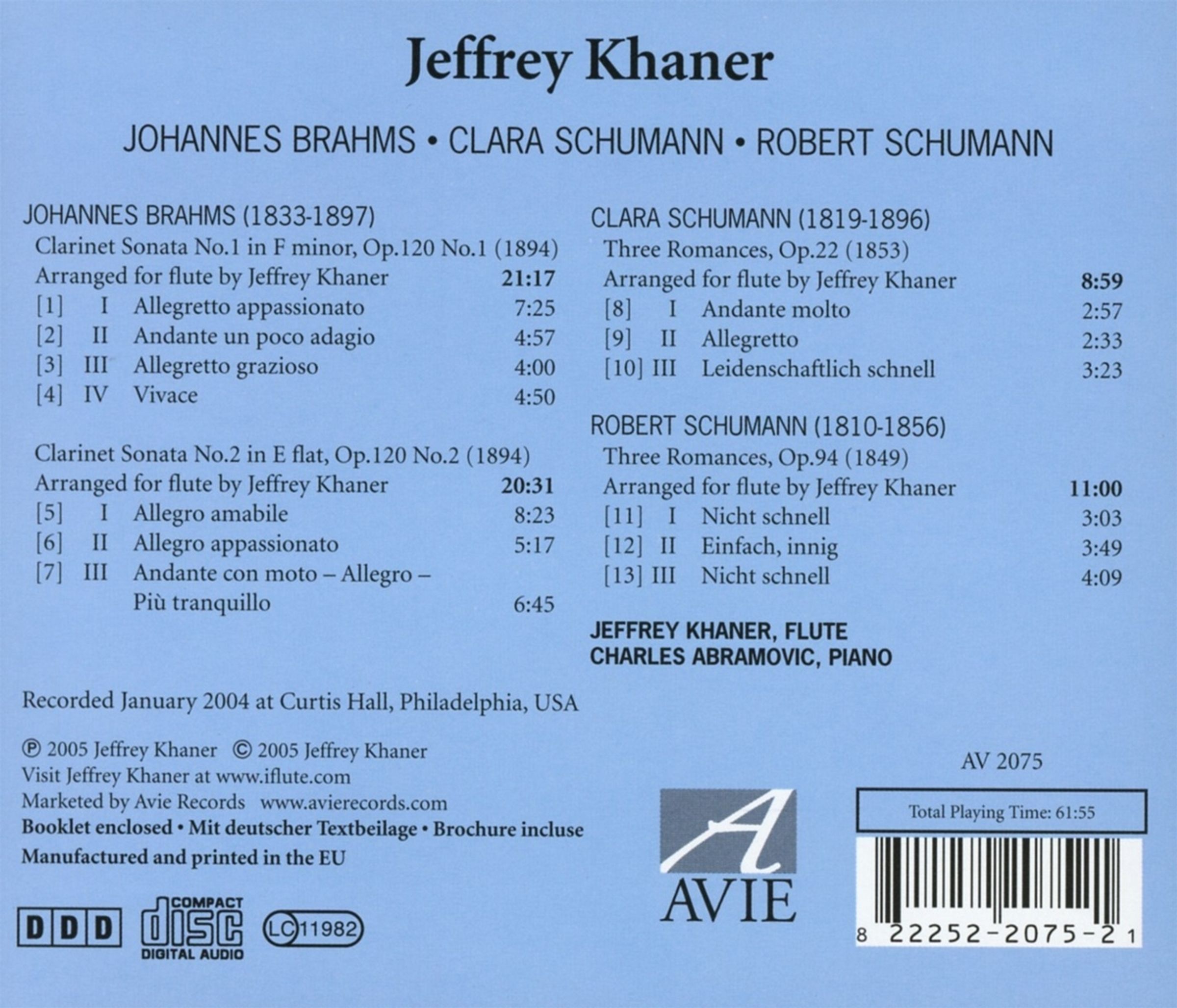 Khaners Bemühungen spiegeln die eigenen Ziele von Brahms wider: eine breitere Verbreitung der Musik durch die Anpassung an verschiedene Instrumente sicherzustellen. Die genialen Füllstücke sind Khaners Transkriptionen zweier Drei Romanzen, jeweils eine Vertonung von Robert und Clara Schumann, engen Freunden von Brahms.