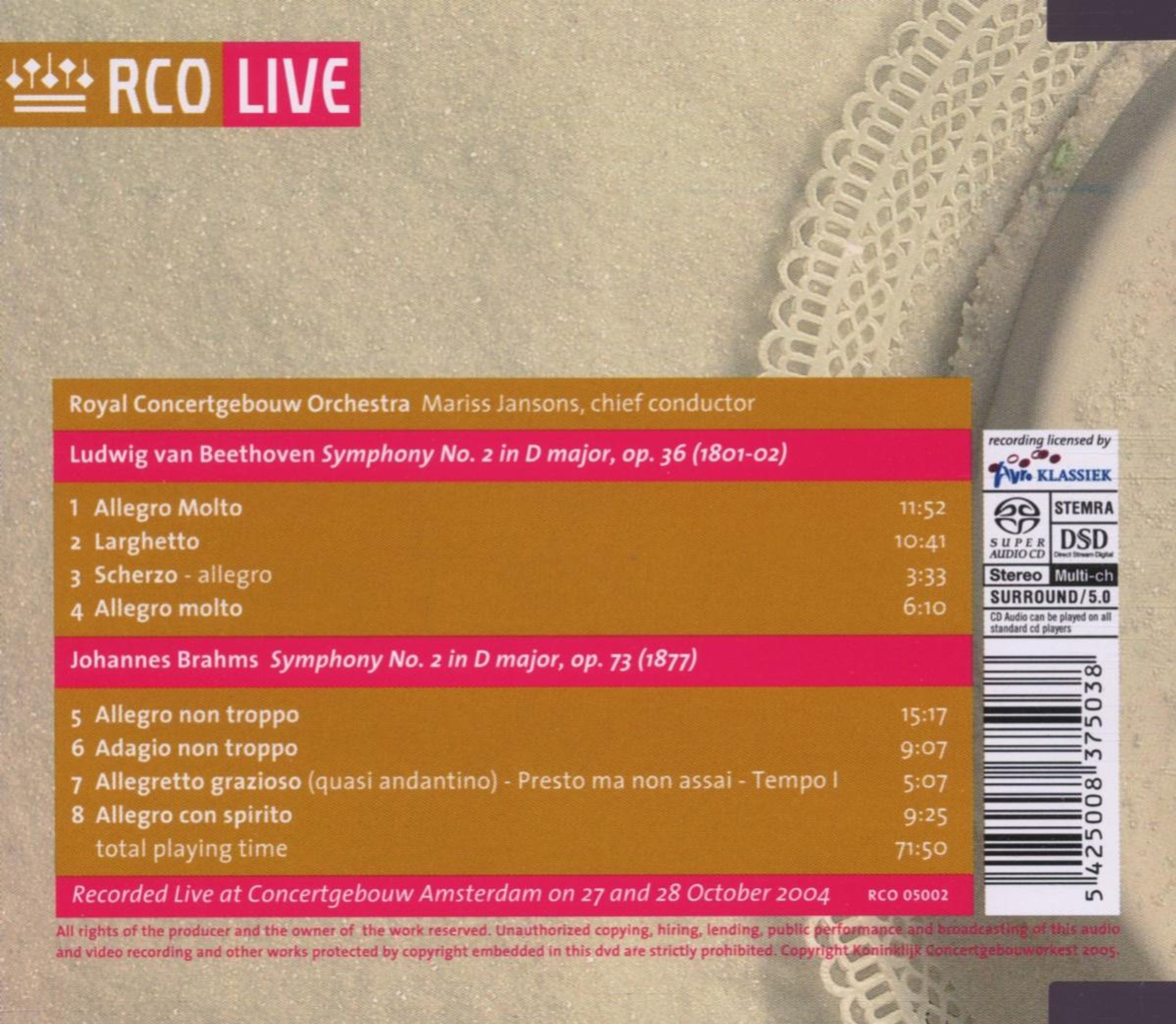 FonoForum 10/05: »Mariss Janons' neueste Scheibe mit den beiden populären ›Zweiten‹ von Beethoven und Brahms vermittelt im 5. 0-Modus eine geradezu ideale Balance zwischen atmender Räumlichkeit und attackierender Präsenz, zwischen Klangspektrum und Stimmenkontur, zwischen Körper und Detail.«Disk 1 von 1 (SACD)