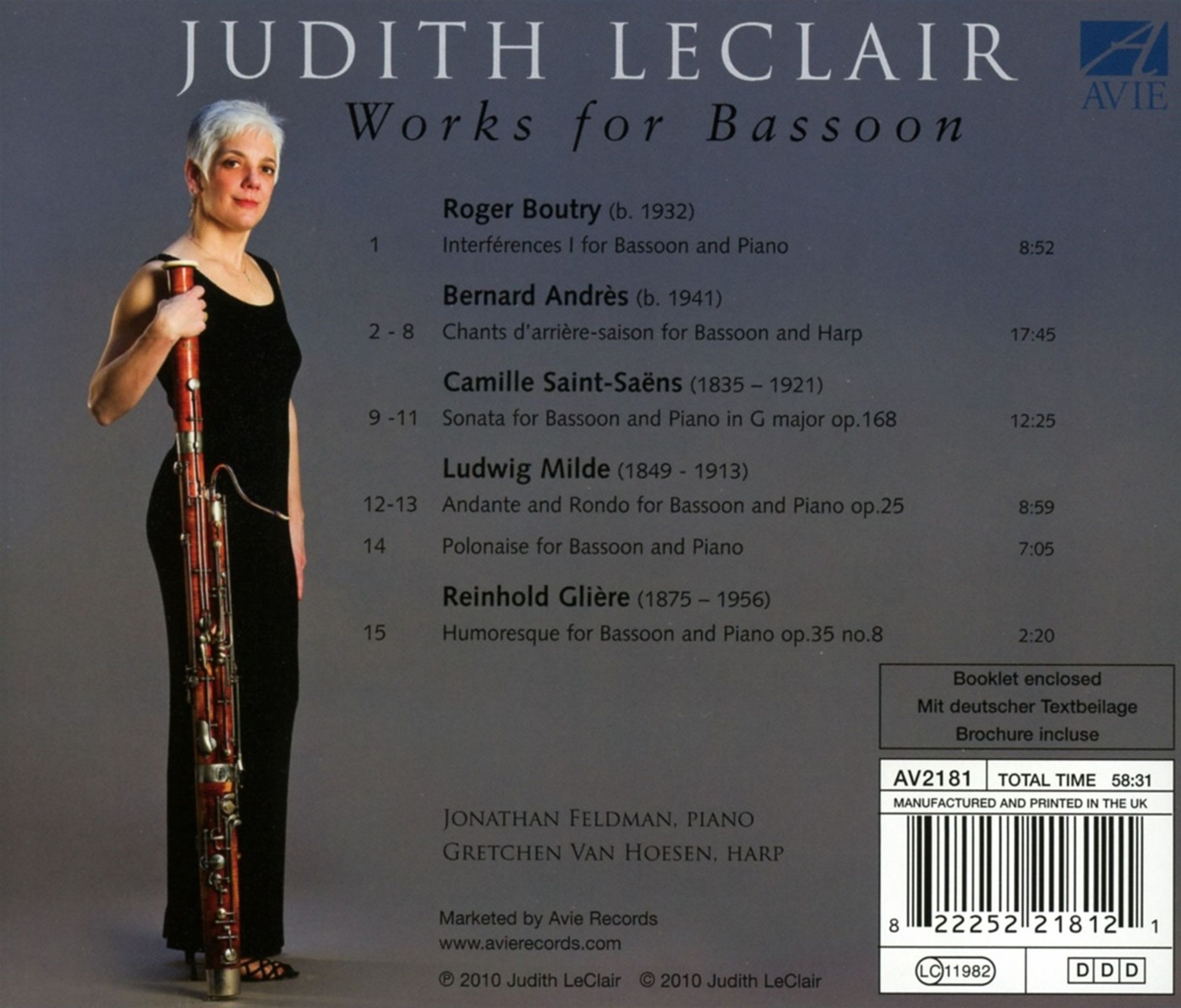 Von Roger Boutrys modernistischen Interférences I und dem an Chopin erinnernden Andante und der bravourösen Polonaise des relativ unbekannten deutschen Fagottisten Ludvig Milde bis hin zu Bernard Andrès' nostalgischen Chants D'arriere-Saison (»Lieder einer vergangenen Jahreszeit«), Camille Saint-Saëns' magischer Sonate und Reinhold Glières unwiderstehlicher Zugabe Humoresque – Judith LeClair und Freunde werden das Fagott mit Sicherheit im Vordergrund halten.