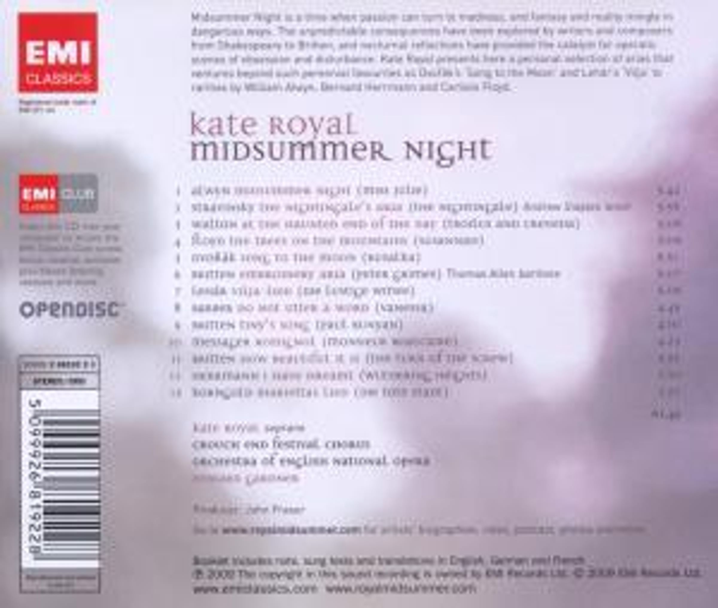 Stereoplay 07/09: "'Diese Musik ging mir in einer Weise unter die Haut, wie ich es bis dahin nicht erlebt hatte', schreibt die Sopranistin in ihrem Booklet-Text. Ähnlich wird es vielen Hörern gehen, wenn sie Kate Royal hören.'Midsummer Night', der Titelsong der CD, stammt aus der Oper 'Miss Julie' von William Alwyn - und bei Kate Royal klingt diese Szene zugleich so sinnlich und eindringlich, dass man neugierig wird, wie wohl die ganze Oper klingt. Orchestral sind all diese 'Twentieth Century Highlights" beim Orchester der English National Opera und Edward Gardner in besten Händen."Disk 1 von 1 (CD)