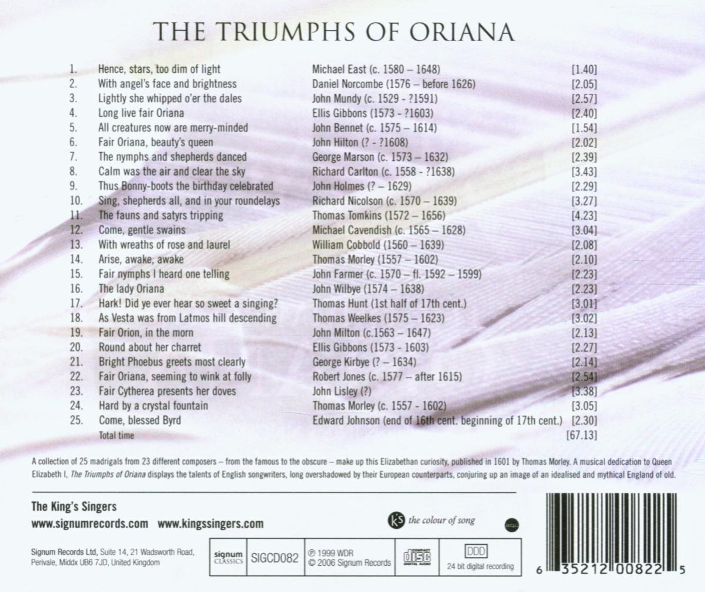 "The Triumphs of Oriana" ist der Titel einer Sammlung von 23 Komponisten die 1601 zu Ehren Elizabeth I. erschien und die Blüte der englíschen Musik dokumentiert. Solch hochrangige Musik ist bei den King's Singers natürlich in den allerbesten Händen.