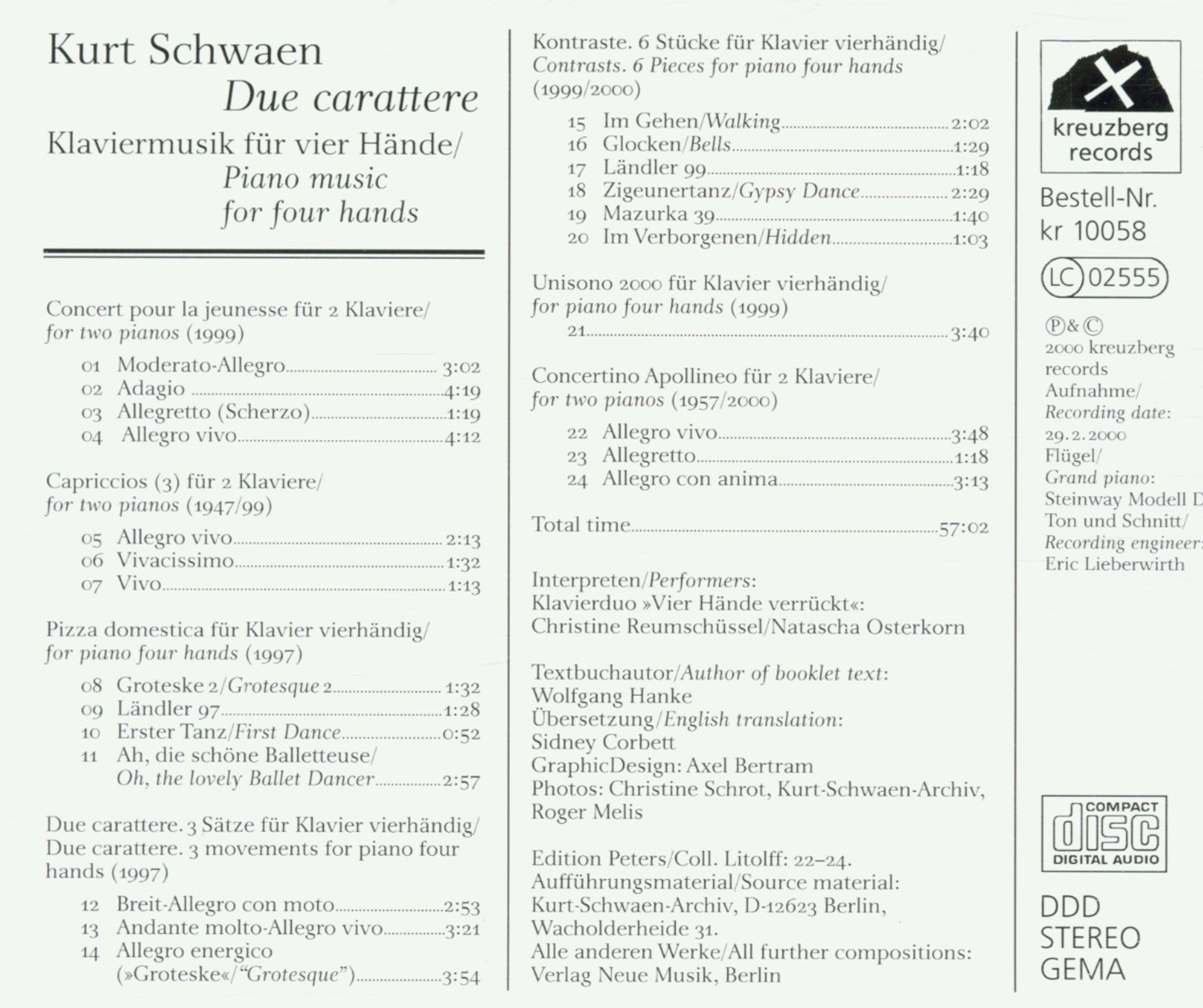 Kurt Schwaen: Klavierwerke zu 4 Händen auf CD