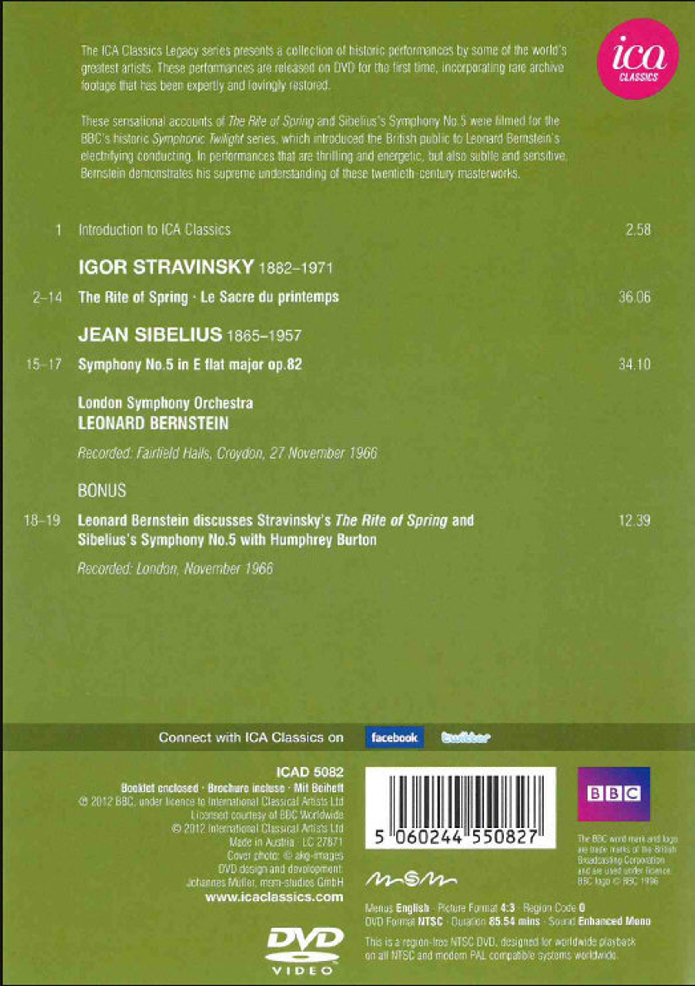 Diese sensationellen Aufführungen von Le Sacre du Printemps und Sibelius’ 5. Sinfonie wurden für die historische Symphonic Twilight-Reihe der BBC gefilmt, die dem britischen Publikum Leonard Bernsteins elektrisierende Dirigierkunst vorstellte. In Aufführungen, die mitreißend und energiegeladen, aber auch subtil und einfühlsam sind, zeigt Bernstein sein überragendes Verständnis dieser Meisterwerke des 20. Jahrhunderts.