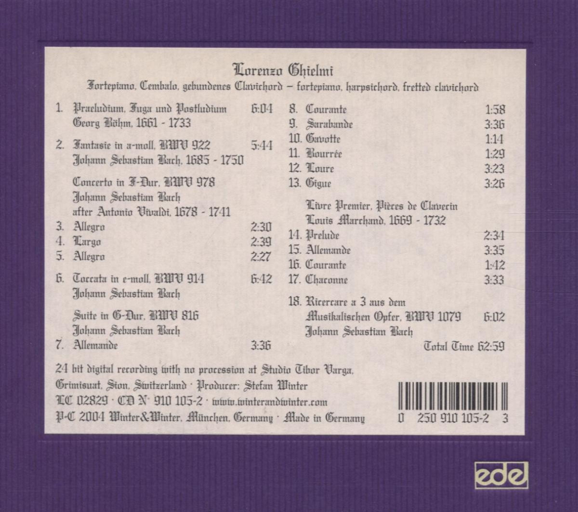 »Wenn man sich mit Bach beschäftigt, stößt man früher oder später auf den Namen Johann Nikolaus Forkel. Ihm ist die Aufbewahrung vieler Bach Handschriften zu verdanken und seine erste Biographie des Komponisten liegt heute fast in jeder Hausbibliothek eines Musikers. So lag es auch seit langer Zeit in meinem Bücherschrank, aber ich habe erst in den letzten Jahren gemerkt, wie wichtig, lebendig und interessant dieses Pionierwerk Forkels noch heute ist. Die Besonderheit liegt in der detaillierten, aber doch einfachen Beschreibung, so daß das Werk jedermann und nicht nur dem Spezialisten zugänglich ist. Einige Anekdoten sind so farbig und mitreißend geschildert, daß ich auf die Idee kam, bei Konzerten diese Textpassagen wie einen Kommentar zur Musik vorlesen zu lassen. Wie anders klingt eine Fantasie des sechzehnjährigen Johann Sebastian, wenn man Forkels Beschreibung über die ersten Komponierversuche Bachs gelesen hat oder daß das Ricercare a 3 wie eine Improvisation auf einem Silbermann Flügel erklingen soll. Nun erlaubt es uns auch die Technik, Marchand und Bach im Vergleich zu hören und dies sogar auf einem deutschen und einem französischen Cembalo!« - Lorenzo Ghielmi