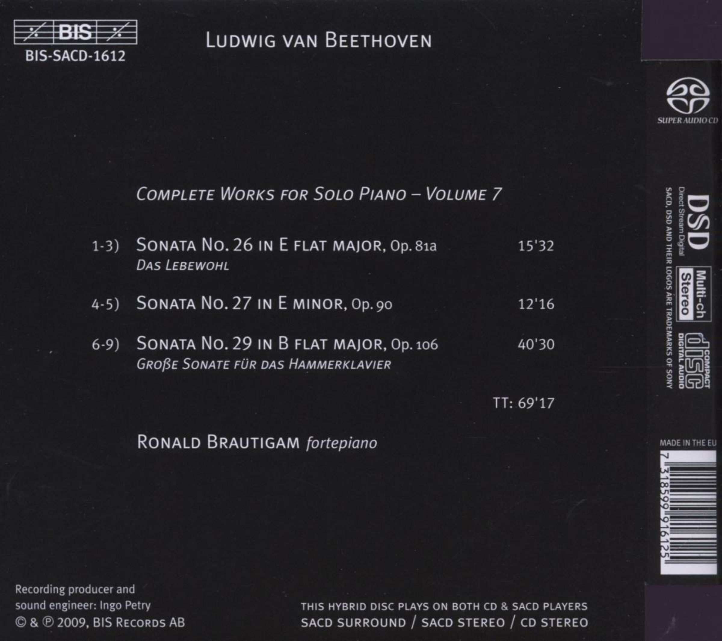 In the most central and often-recorded repertoire, it is far from easy for a musician to make reviewers sit up and notice what he or she is doing. But with his cycle of Beethoven’s works for solo piano, it is safe to say that Ronald Brautigam has amply succeeded. He has so far given us a ‘Pathétique’ that the website klassik. com found ‘almost impossible to describe in words’ and a ‘Mondschein’ that according to International Record Review ‘goes to the heart of what Beethoven was surely driving at’. As for the ‘Waldstein’, the reviewer in Classica-Répertoire ‘had never heard it ring out with more freshness, youthful spirit and conquering ardour’, while his Spanish colleague in Scherzo advised that listening to Brautigam’s ‘Appassionata’ would result in ‘a rarely experienced rush of adrenaline’. On a more general level, the cycle has – even before completion – been deemed to show the promise of becoming ‘a milestone in Beethoven interpretation’ (klassik. com), and ‘a Beethoven piano-sonata cycle that challenges the very notion of playing this music on modern instruments, a stylistic paradigm shift’ (Fanfare). The fact that Brautigam plays these works on the fortepiano has added to the interest, but the most common comparisons in reviews are to the legendary recordings of Schnabel, Brendel, Kovacevich or Arrau – in the words of the Fanfare reviewer ‘one hears playing on such an exalted artistic and technical level as to constitute a veritable lexicon of what may be achieved on a piano (of whatever vintage.) ... Brautigam's interpretations, exuding wisdom and joy, revere Beethoven without idolizing him.’ With Volume 7 of the cycle, Brautigam has arrived at one of the pinnacles of the piano repertoire, the monumental ‘Hammerklavier Sonata’. Once more he gives his listeners the opportunity to revisit a well-known work, and experience it in a fresh light, as a result of the clarity and distinctive timbre of Brautigam’s chosen instrument, and his superb, but never self-serving technical command of it. Included on the disc are also Sonata No. 26 (‘Das Lebewohl’ or ‘Les Adieux’) and Sonata No. 27 in E minor, Op. 90.