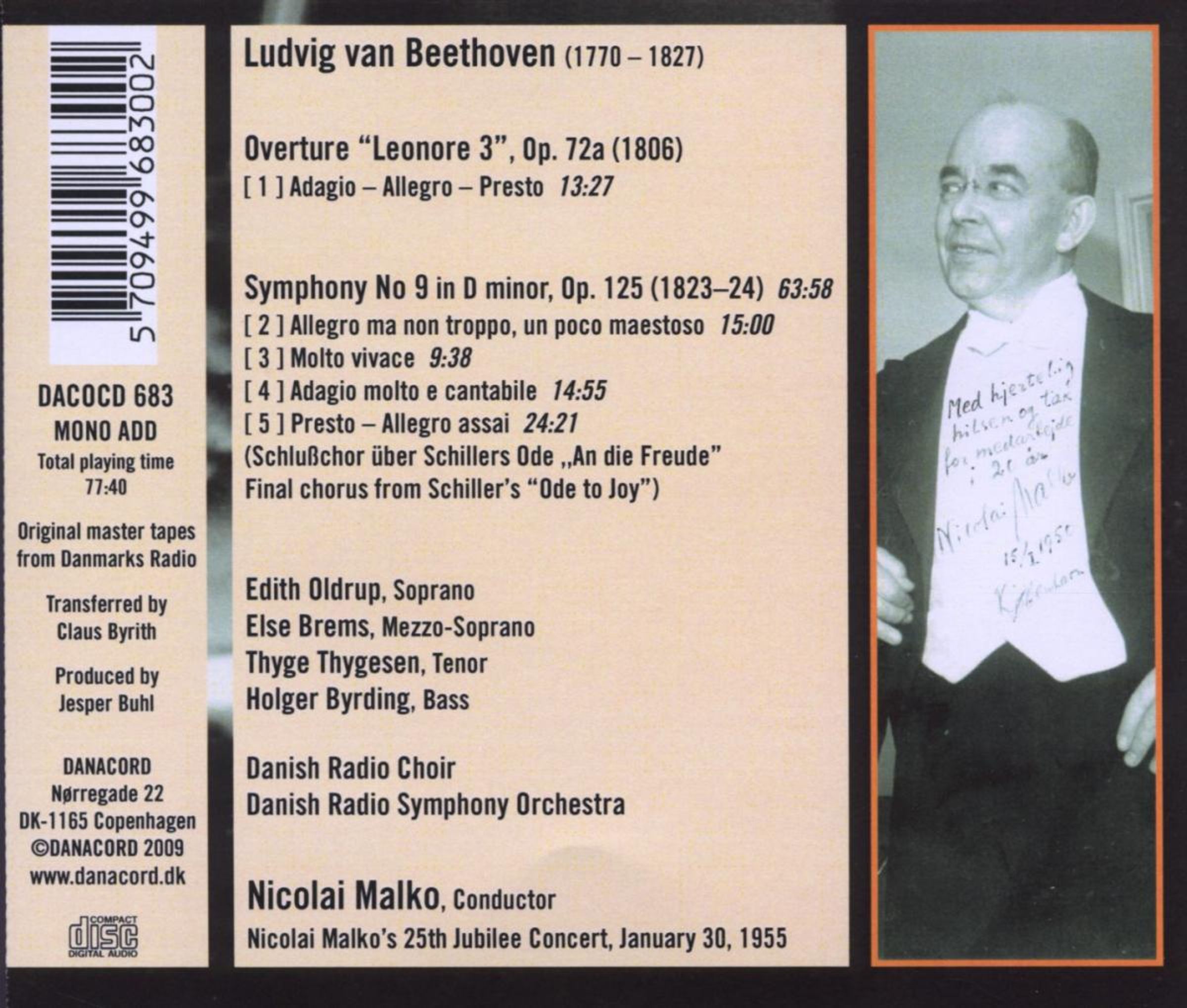 Zum ersten Mal auf CD: Am 30. Januar 1955 beging Malko, einer der bedeutendsten russischen Dirigenten des 20. Jahrhunderts, seine bis dahin fünfundzwanzigjährige Zusammenarbeit mit dem dänischen RSO mit einem Beethoven-Konzert. Malko-typisch hat die 9. Symphonie in seiner Interpretation nichts hymnisch-lyrisches, sondern wird zu einem dramatischen Ereignis. Die Aufnahme ist klangtechnisch in erstaunlich gutem Zustand und ein wichtiger Beitrag zur Malko-Diskographie.